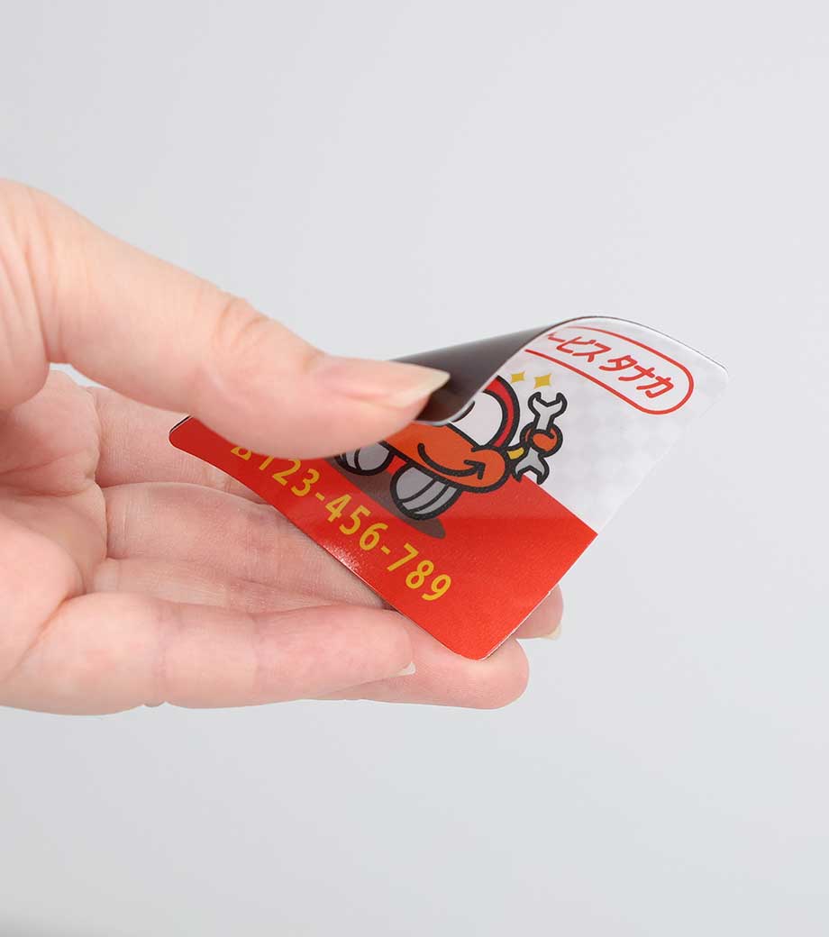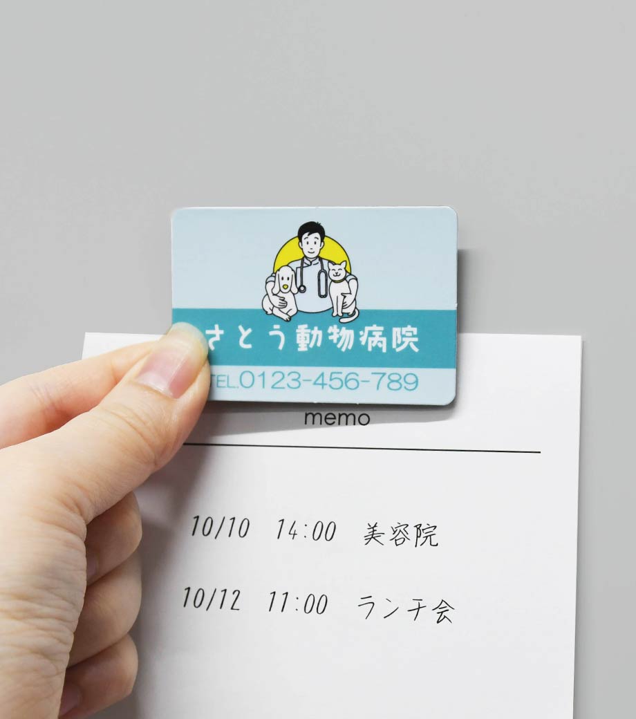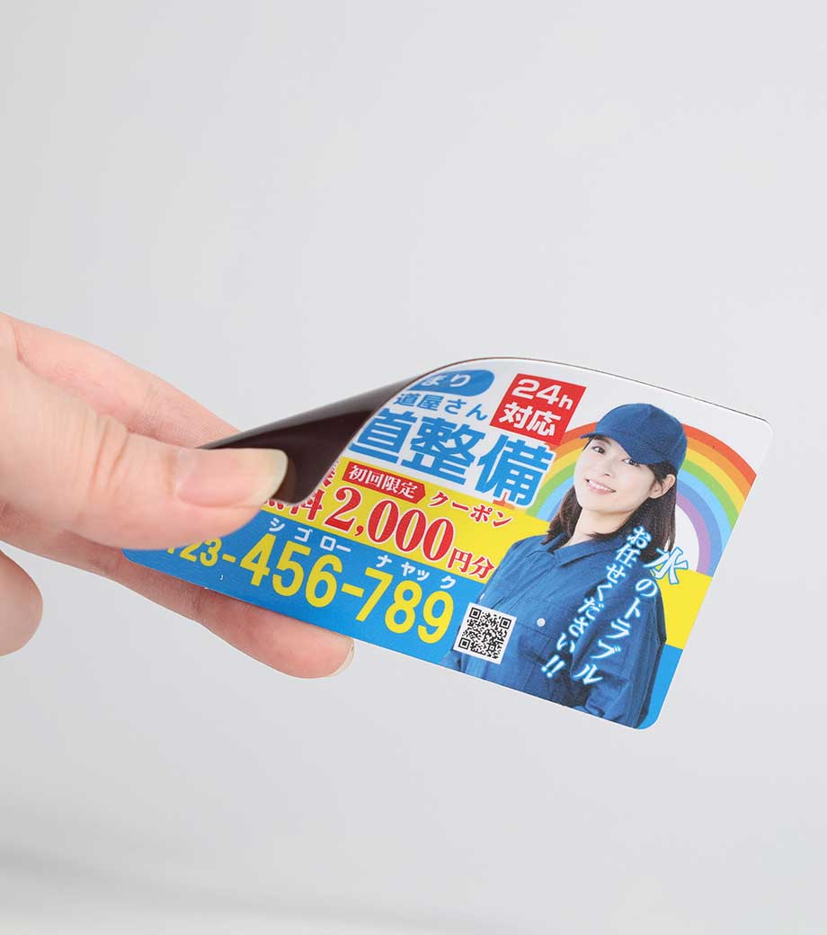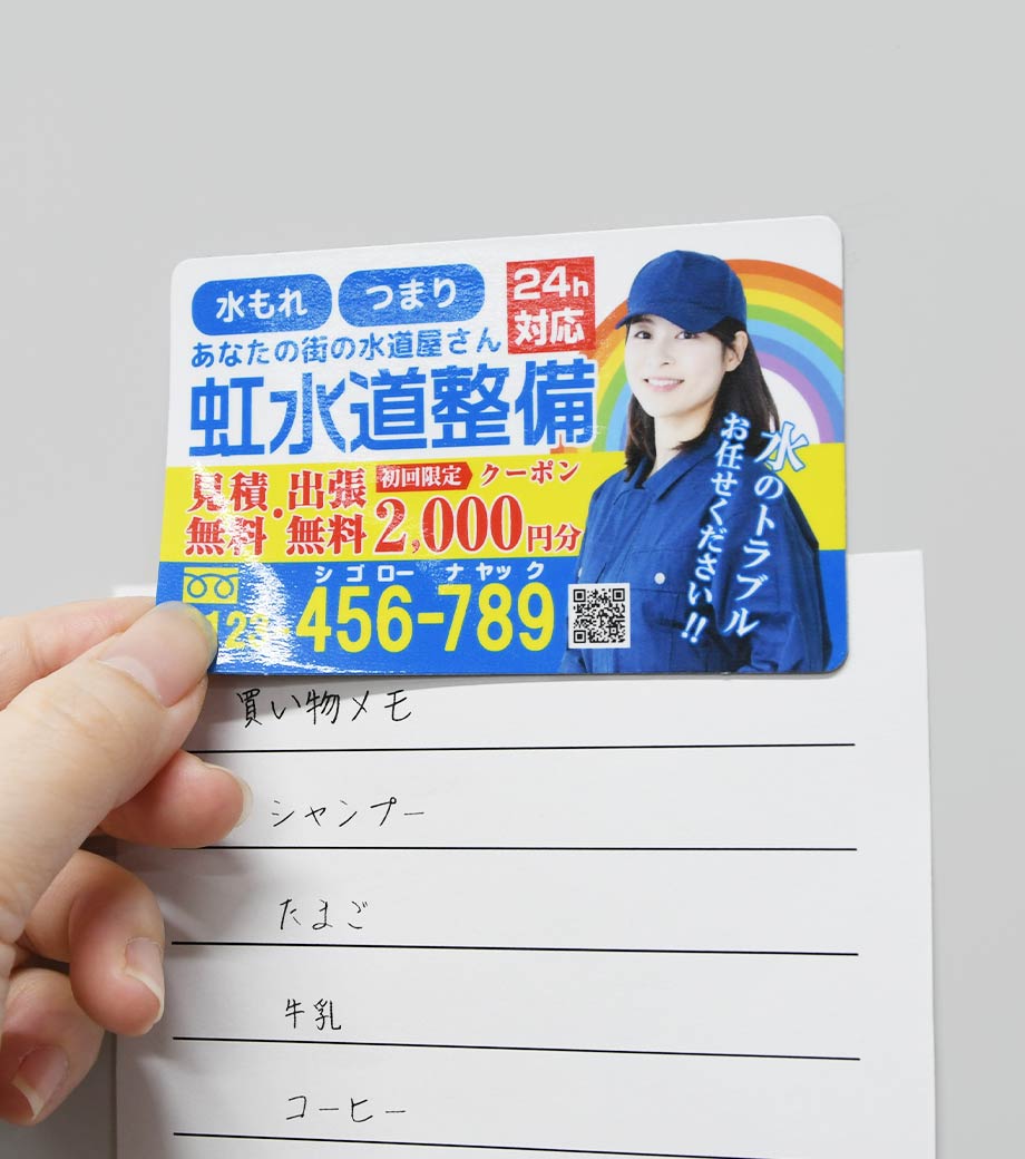 広告や店舗情報をフルカラーで全面に印刷できる、シートタイプのマグネットです。写真やイラストを使ったデザインもOKで、視認性が高く宣伝効果抜群!メモを冷蔵庫や金属製の扉などに貼っておくのにも使えます。扱いやすい90×55mmサイズで、手渡しでもポストインでも配布しやすいです。