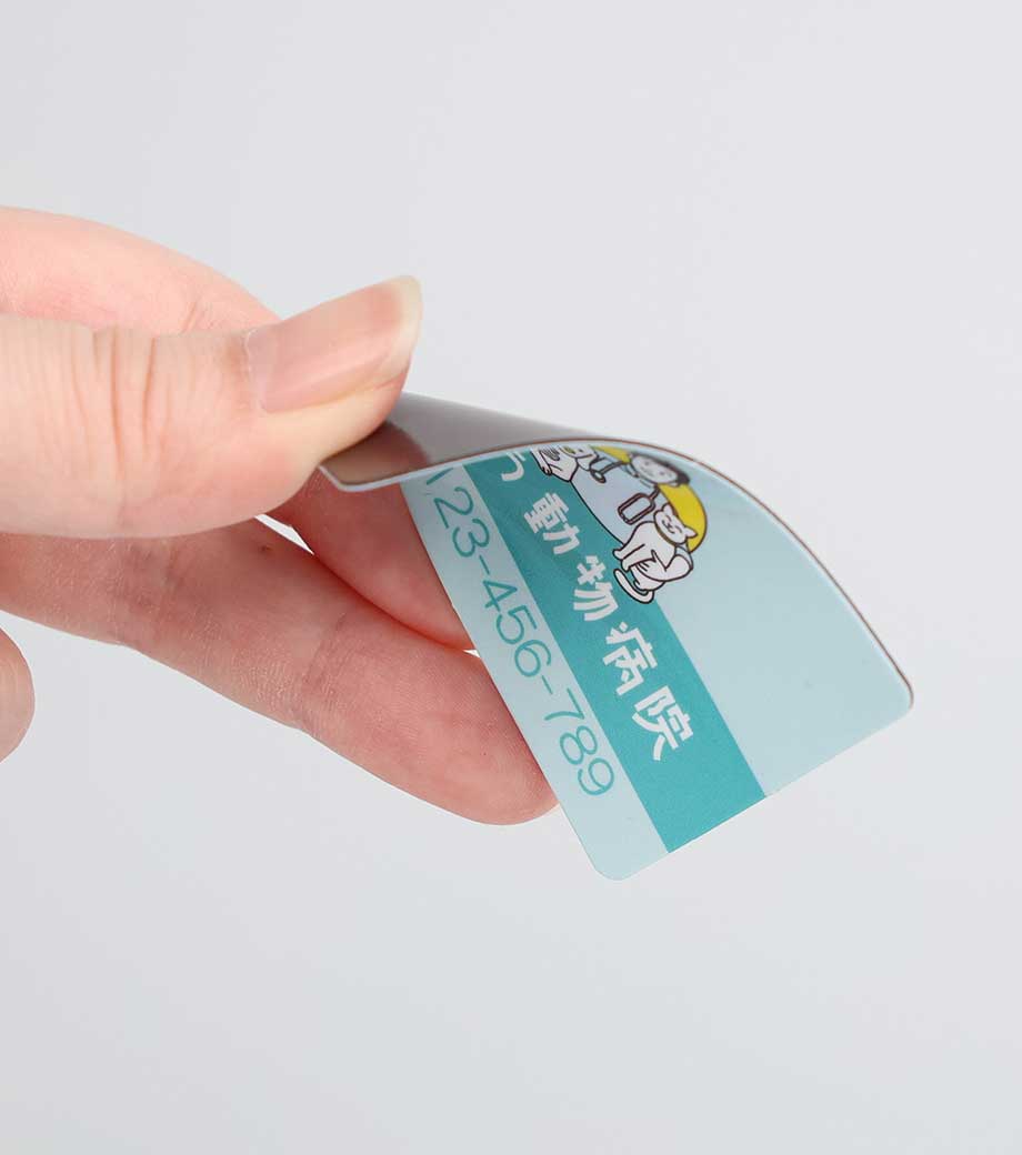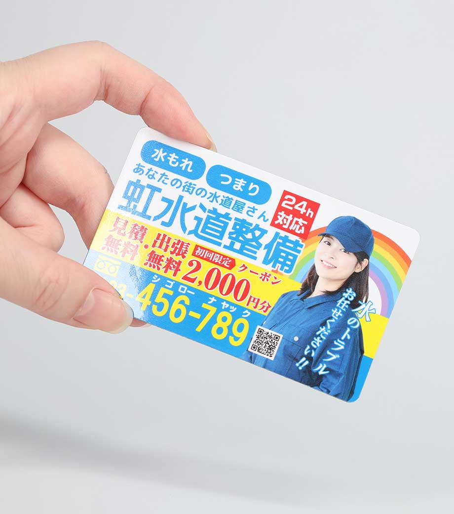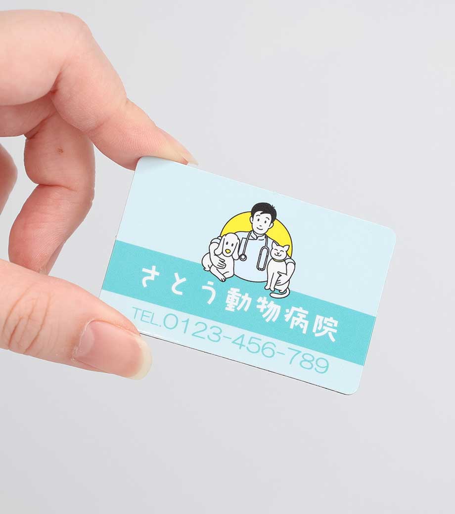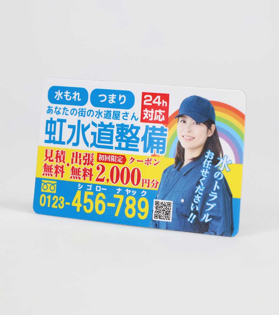 広告や店舗情報をフルカラーで全面に印刷できる、シートタイプのマグネットです。写真やイラストを使ったデザインもOKで、視認性が高く宣伝効果抜群!メモを冷蔵庫や金属製の扉などに貼っておくのにも使えます。扱いやすい90×55mmサイズで、手渡しでもポストインでも配布しやすいです。