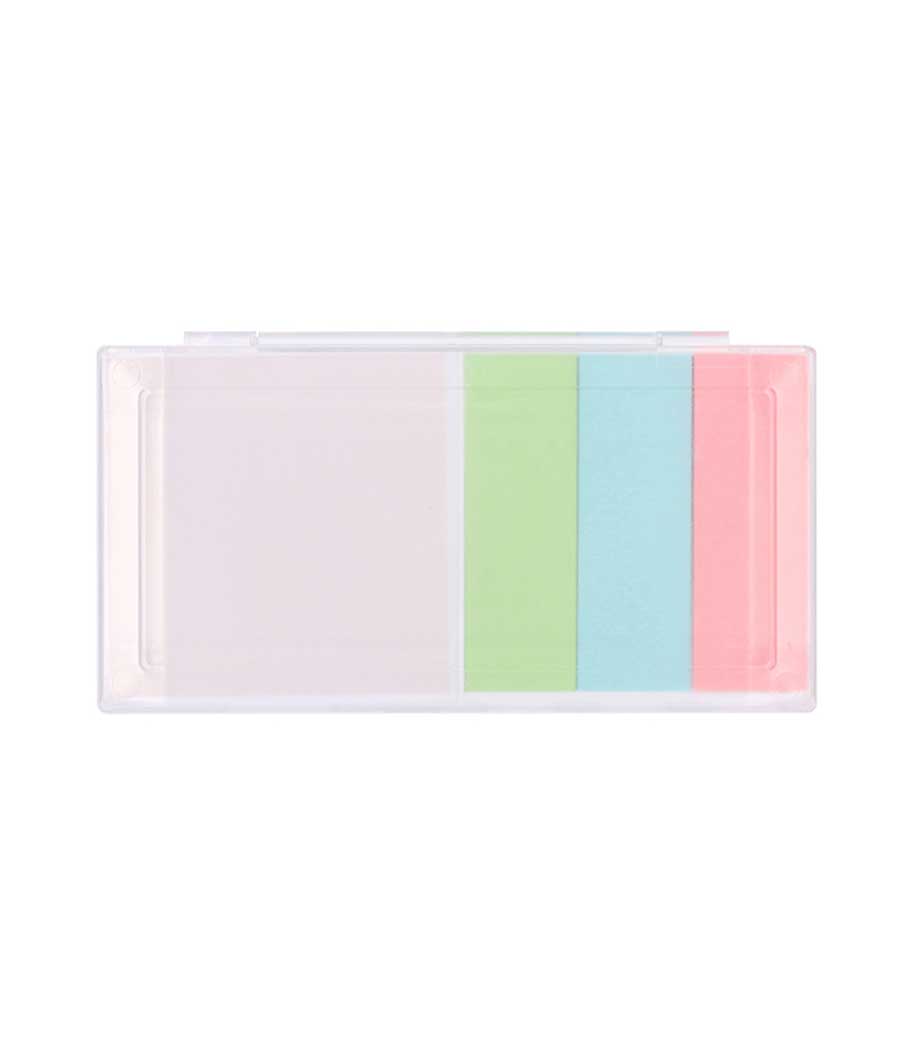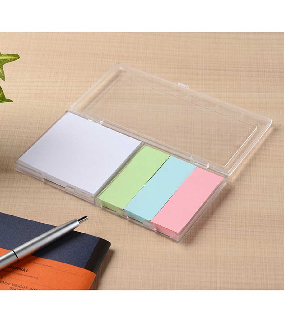 コンパクトケース付箋はスタンドにもなるプラスチックケースに入った定番長方形の4色ふせん。使い勝手の良い場所に立てかけてられ、持ち運ぶ際もバラバラにならないのが魅力です。いくつあっても邪魔にならないフセン。会議やスケジュール管理に大活躍です。