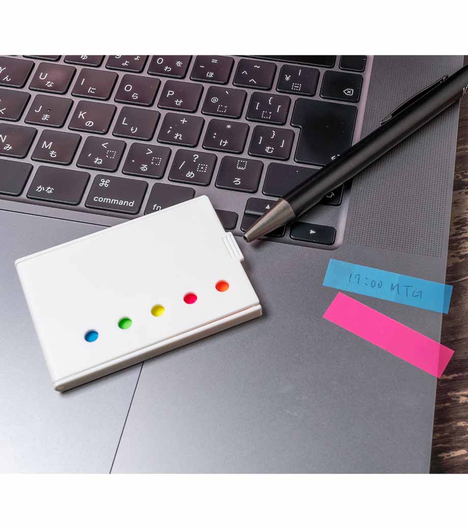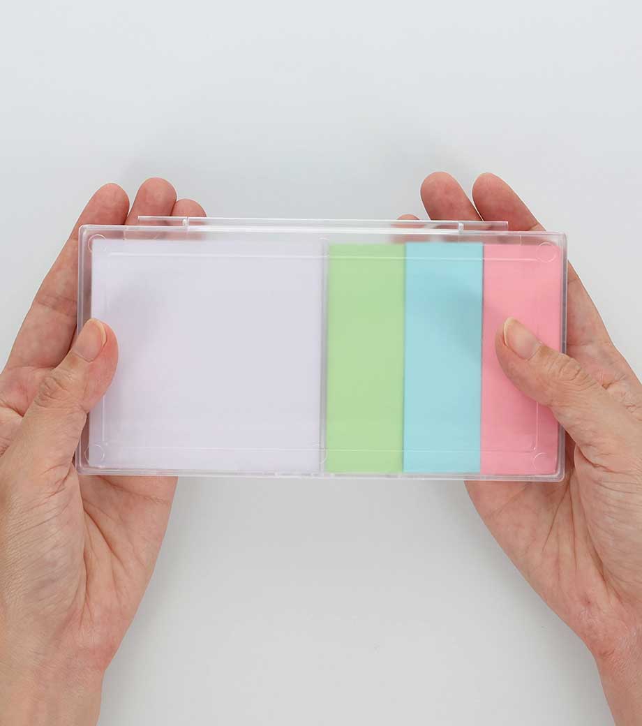 ピッとつまんで取り出せるピックアップ式なので、必要な個所にささっと貼れます。大切なスケジュールに貼っておけば、うっかり忘れの防止に。スーツの胸ポケットにも入る、スリムで携帯しやすいプラケース入りなので、使いたい時にすぐに取り出せます。