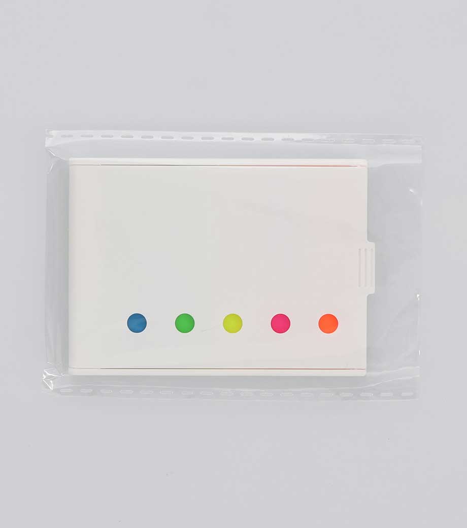 低単価でばらまきにぴったりの付箋セットです。名刺よりも一回り小さいサイズでかさばらず、手に取ってもらいやすいのがポイント。表紙の窓からカラフルな付箋が見え、目を引くデザインになっています。