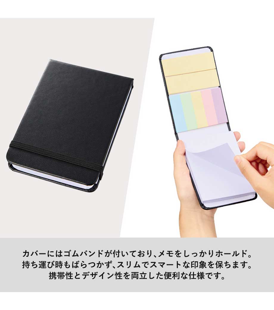 実用的なステーショナリーが、こんなにスタイリッシュに変身。レザー調フセンブックは高級感のあるレザー調のカバーに、5色2サイズの付箋メモをセットしました。