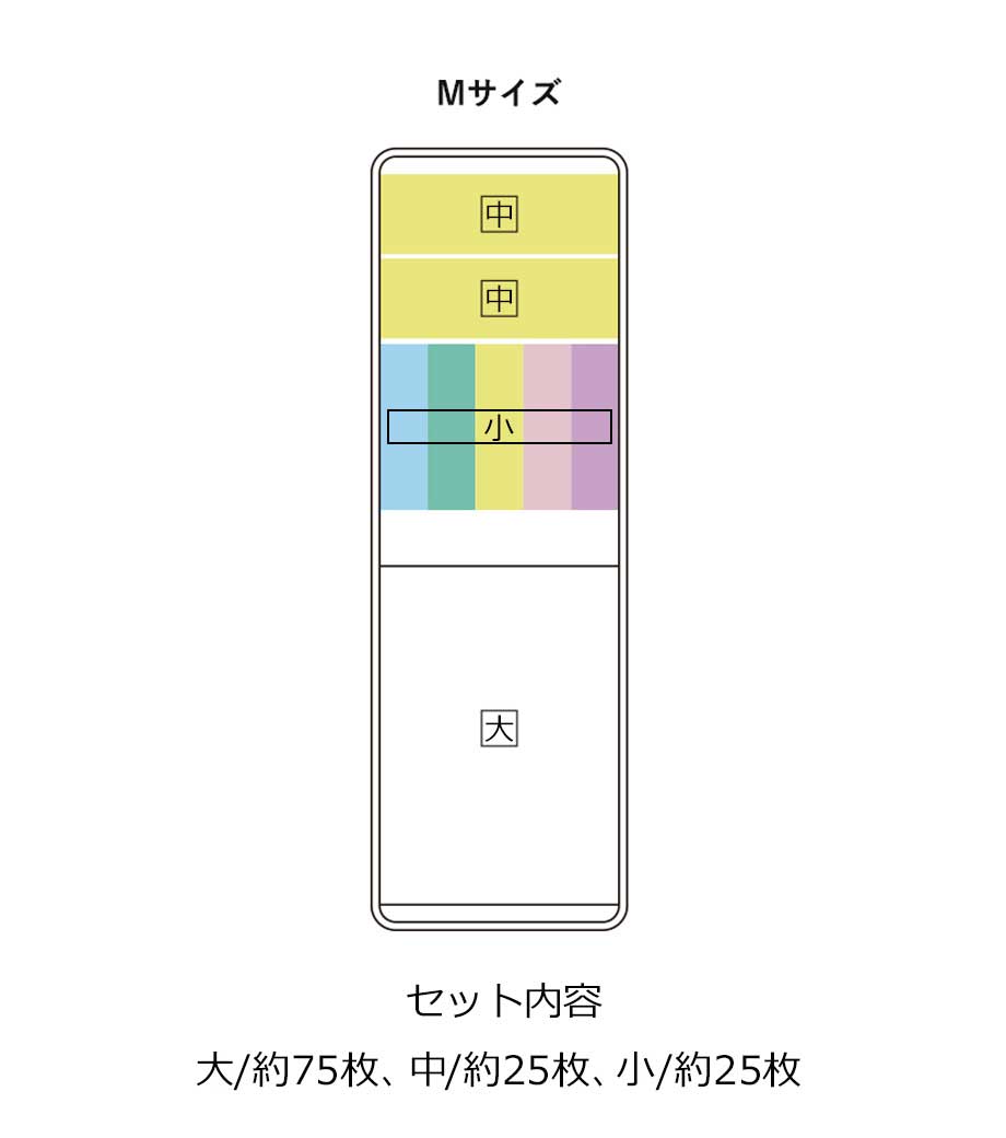 「マルチメモ(M)」は、いろいろなシーンで使える3つのサイズの付箋をワンセット。ちょっとしたメモ、重要箇所のチェック、伝言など、用途に合わせて大・中小の付箋が使い分けられるから便利です。