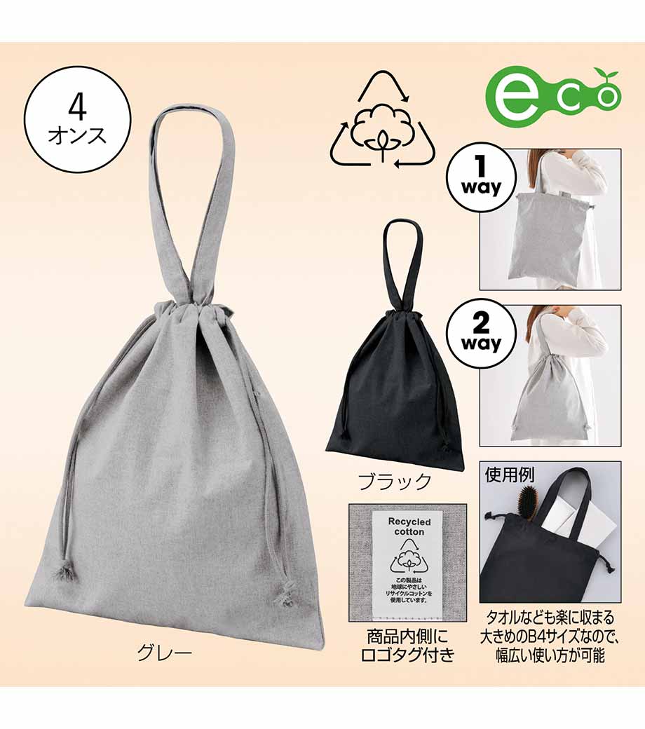 中身が透けて見えない10オンスのマチ付きトートです。肩掛けができ普段使いしやすいA4サイズ。リサイクルコットンを使っているのでSDGs啓発活動のキャンペーン・イベントの参加特典、ノベルティにもオススメです。個包装で配布がしやすく販促効果も期待できます。