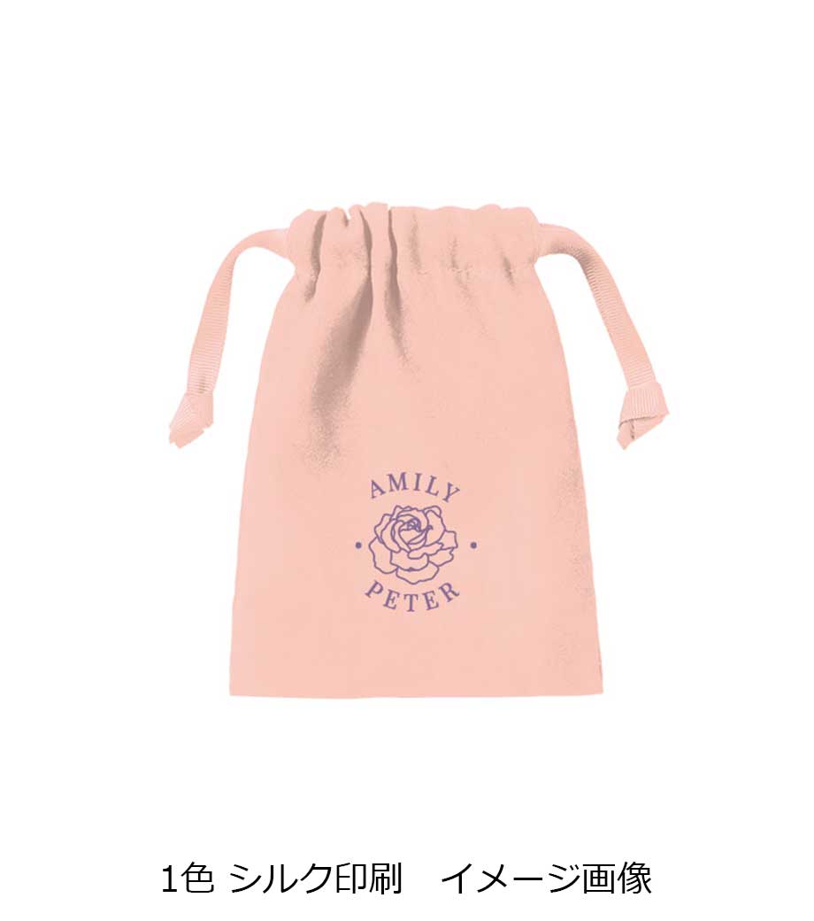 1色ロゴ印刷でオリジナル巾着を製作できます。コスメショップの周年記念や購入特典など、貰って嬉しいノベルティです。