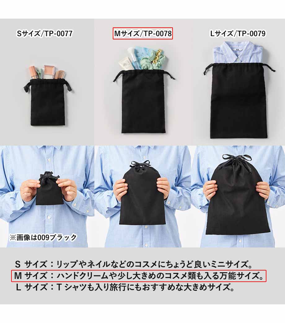 コスメや小物が入るミニサイズから衣類や靴が入る大きめサイズまで幅広くご用意。定番のコットン・麻から、水や汚れに強いポリエステル・ナイロンなど生地素材も豊富です。