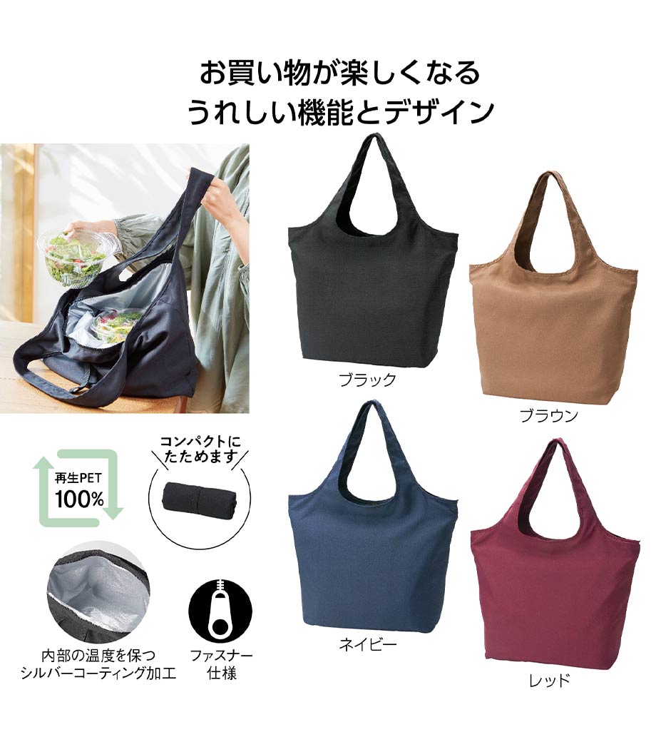 再生PET100%生地を使用した環境に優しいマチ付きマルシェバッグです。柔らかく上質な質感ながら、内側は保冷温機能付きで買い物品をしっかりキープ。大容量サイズなのでスーパーの買い物に便利です。使わない時はコンパクトに折り畳んで持ち運び可能。ファスナー仕様で移動中も中身が飛び出さず安心です。