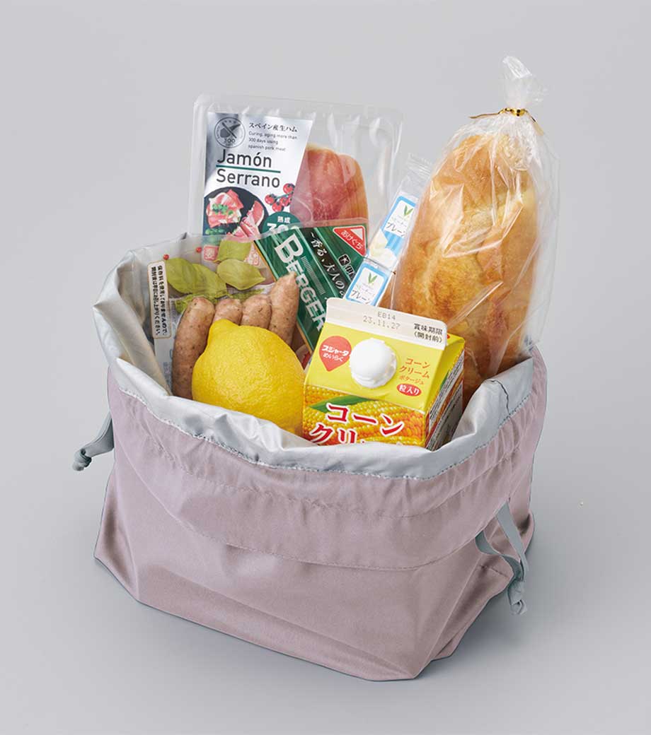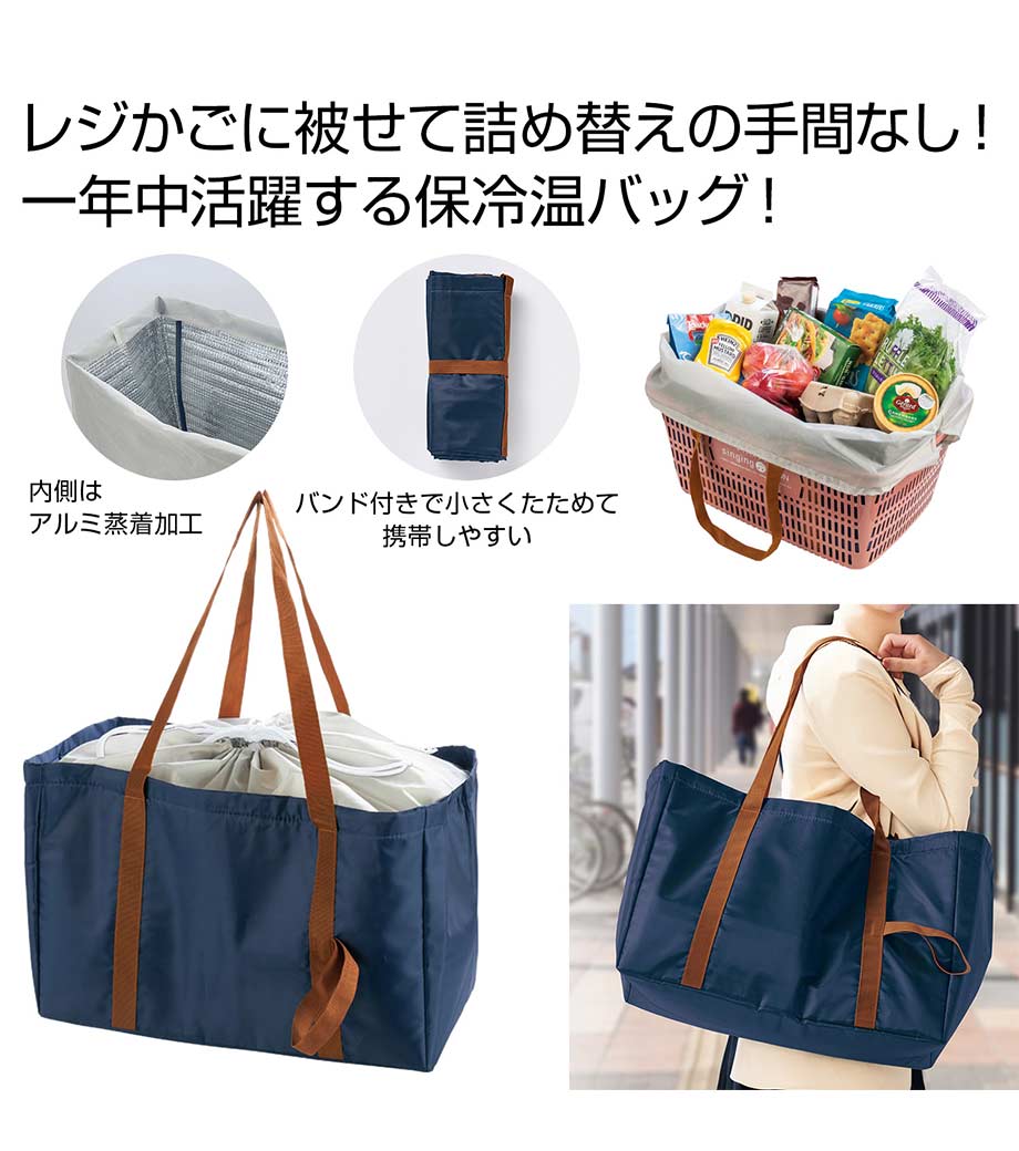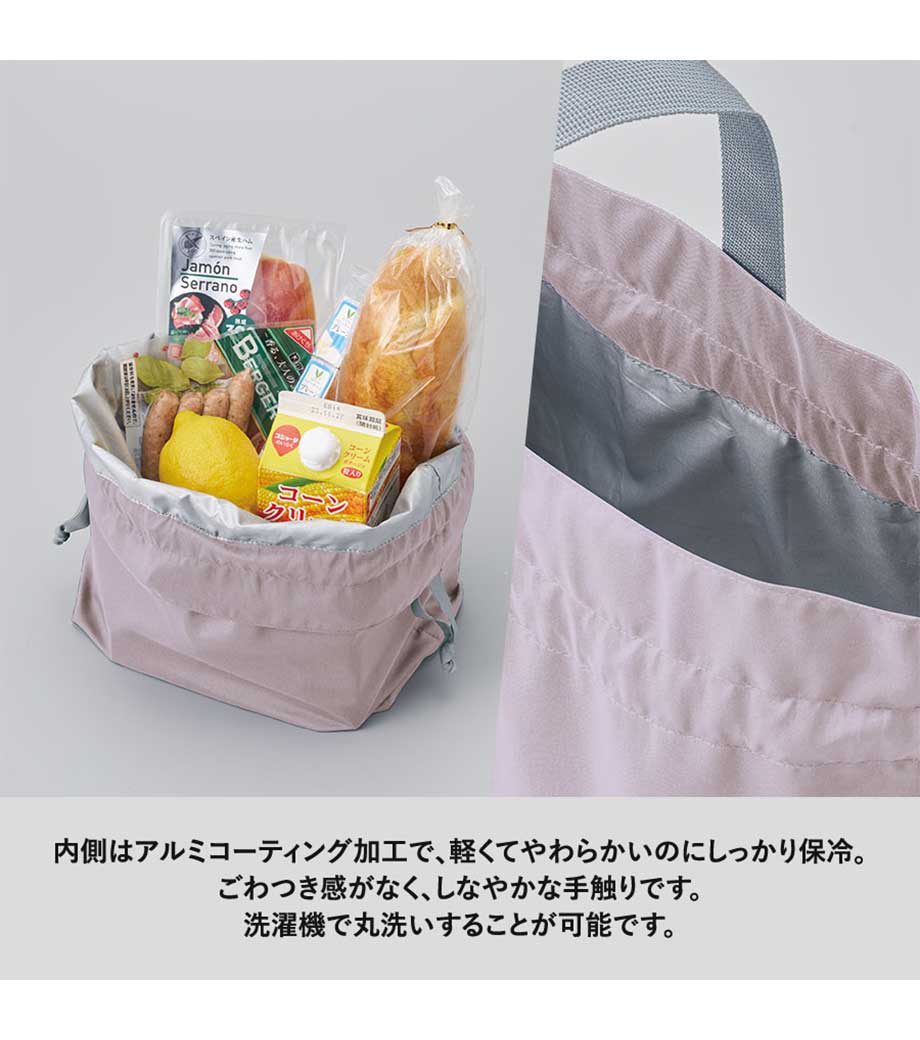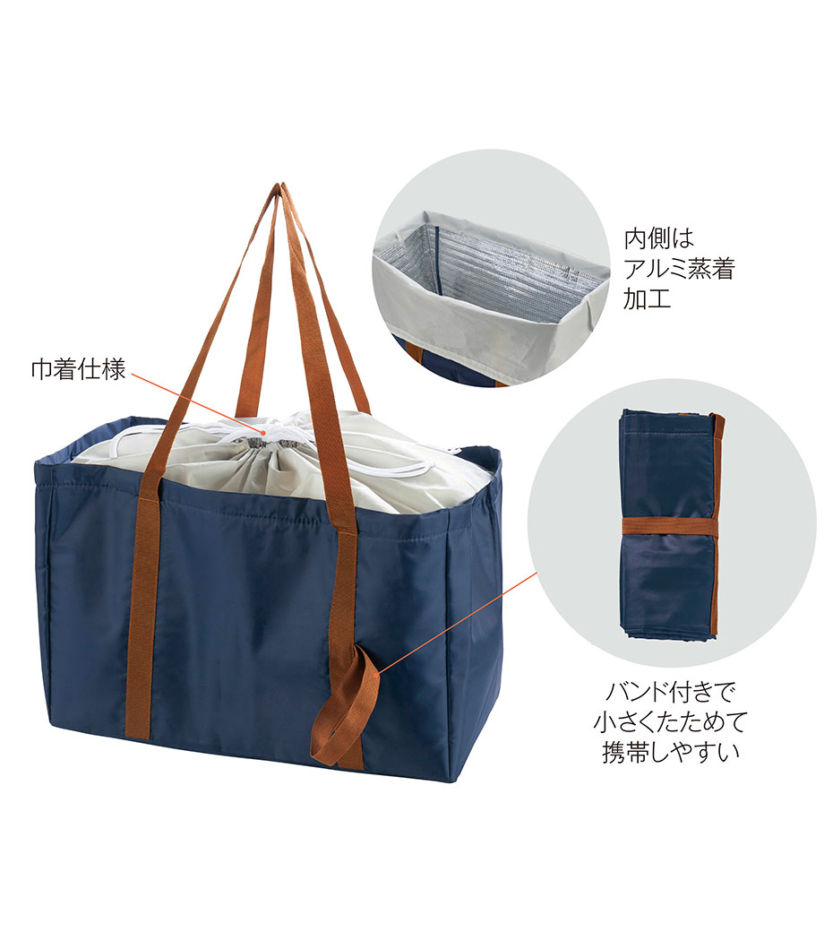 レジかごにセットできる大容量の保冷バッグ。スーパーなどでの会計時、カゴにセットすれば移し替える手間なしでお買い物ができます。使わない時は小さく畳んで付属のゴムバンドでコンパクトに。袋口は巾着タイプで中身の飛び出しを防ぎます。肩掛けできる持ち手で、荷物が重くなっても安心です。