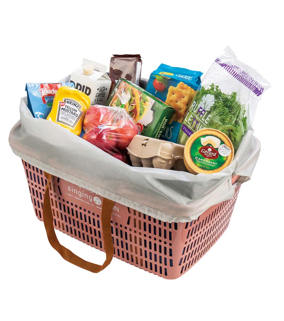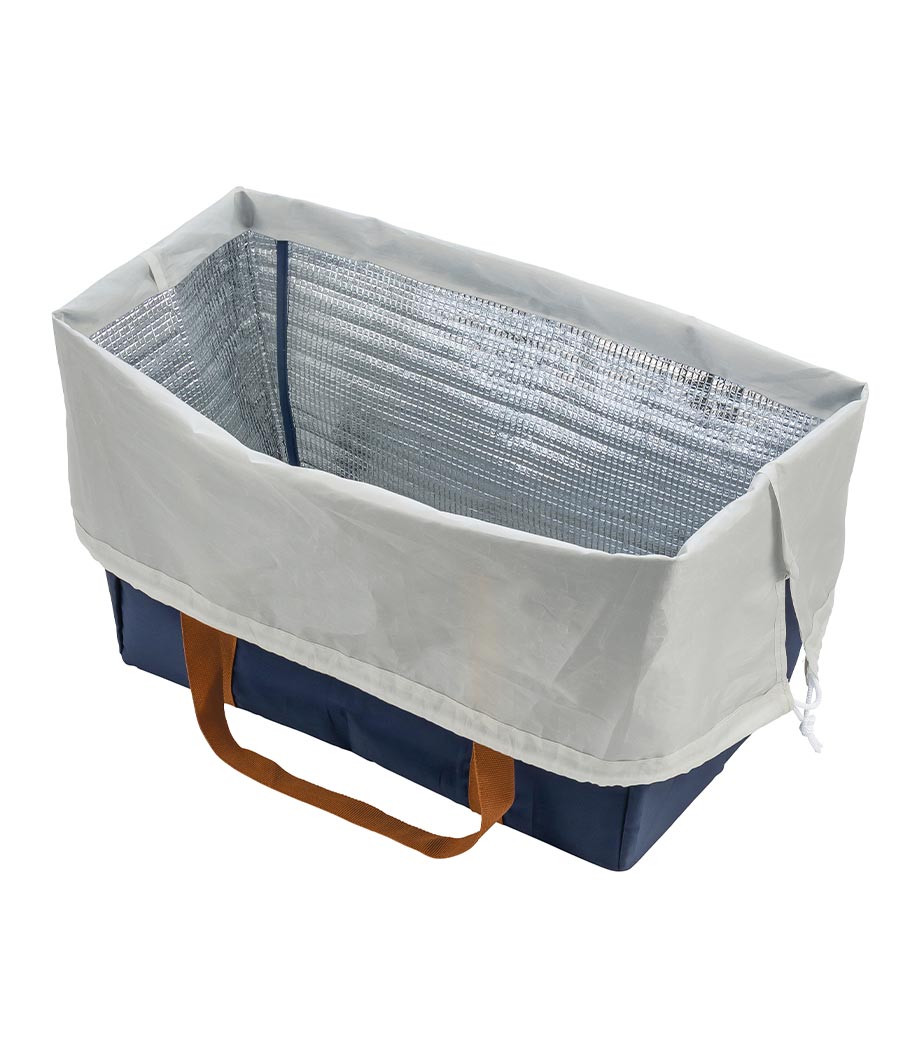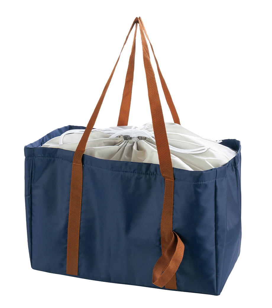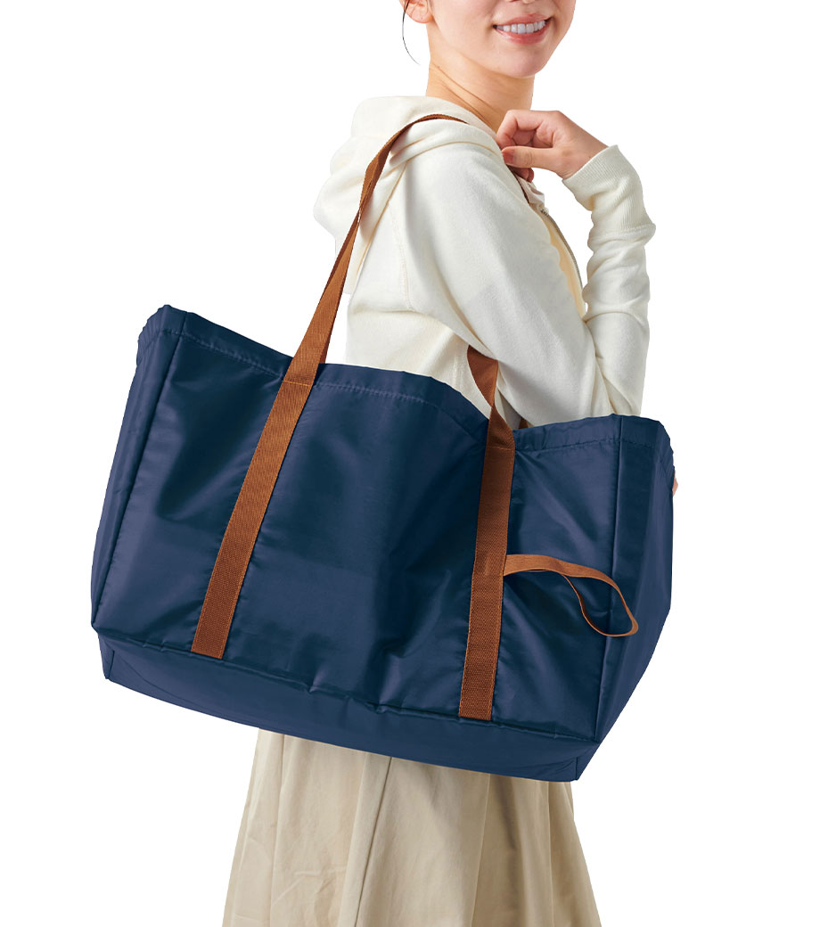 レジかごにセットできる大容量の保冷バッグ。スーパーなどでの会計時、カゴにセットすれば移し替える手間なしでお買い物ができます。使わない時は小さく畳んで付属のゴムバンドでコンパクトに。袋口は巾着タイプで中身の飛び出しを防ぎます。肩掛けできる持ち手で、荷物が重くなっても安心です。