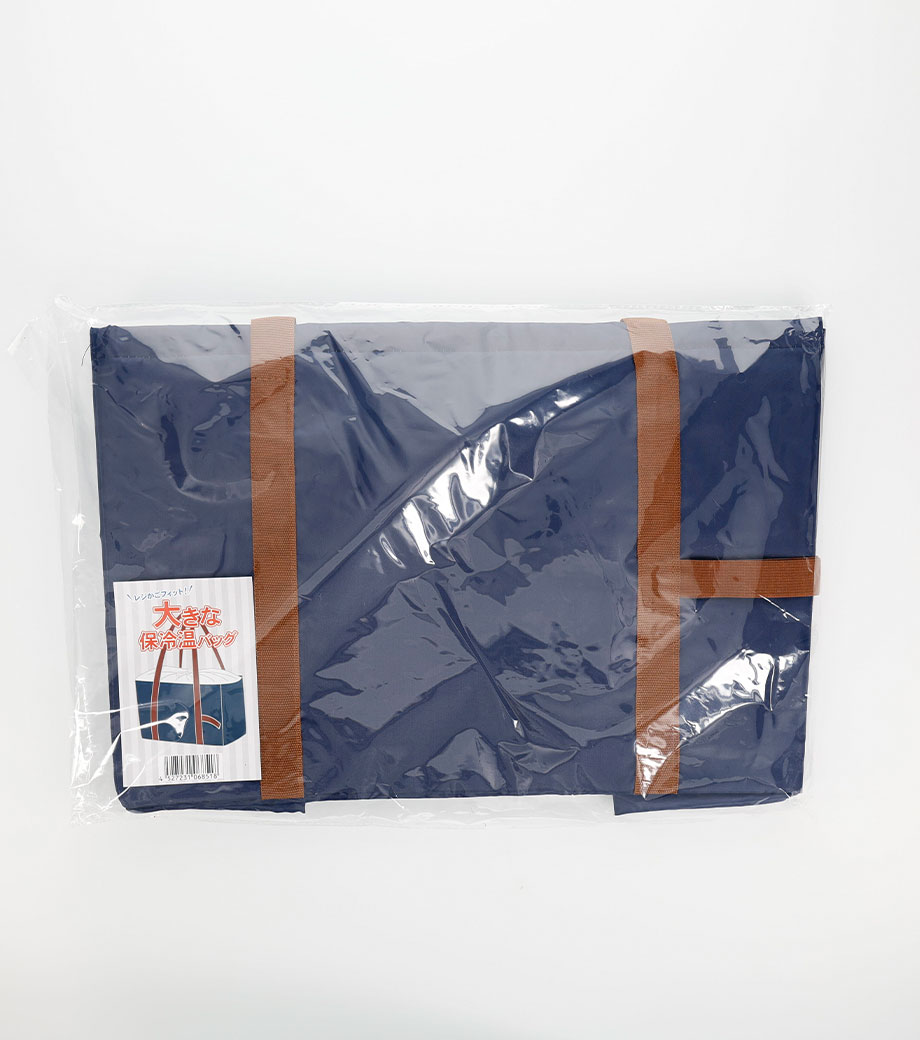 本体色は老若男女問わず使いやすいネイビー。ブラウンの持ち手がアクセントになっています。表面には印刷が可能でオリジナル保冷バッグを製作できます。