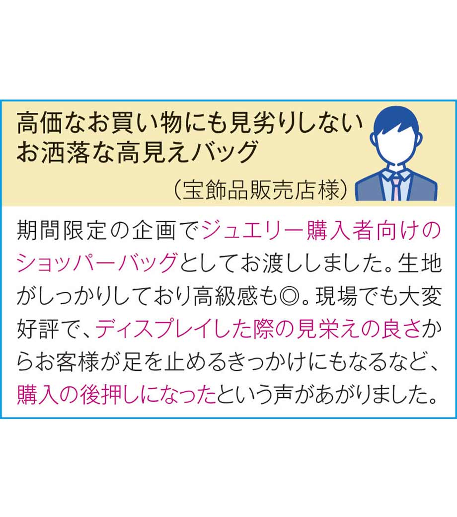 バッグ表面に大きく名入れ印刷できるので、お店や企業のロゴが目立ちます。店舗の購入特典やキャンペーンのノベルティにいかがでしょうか。
