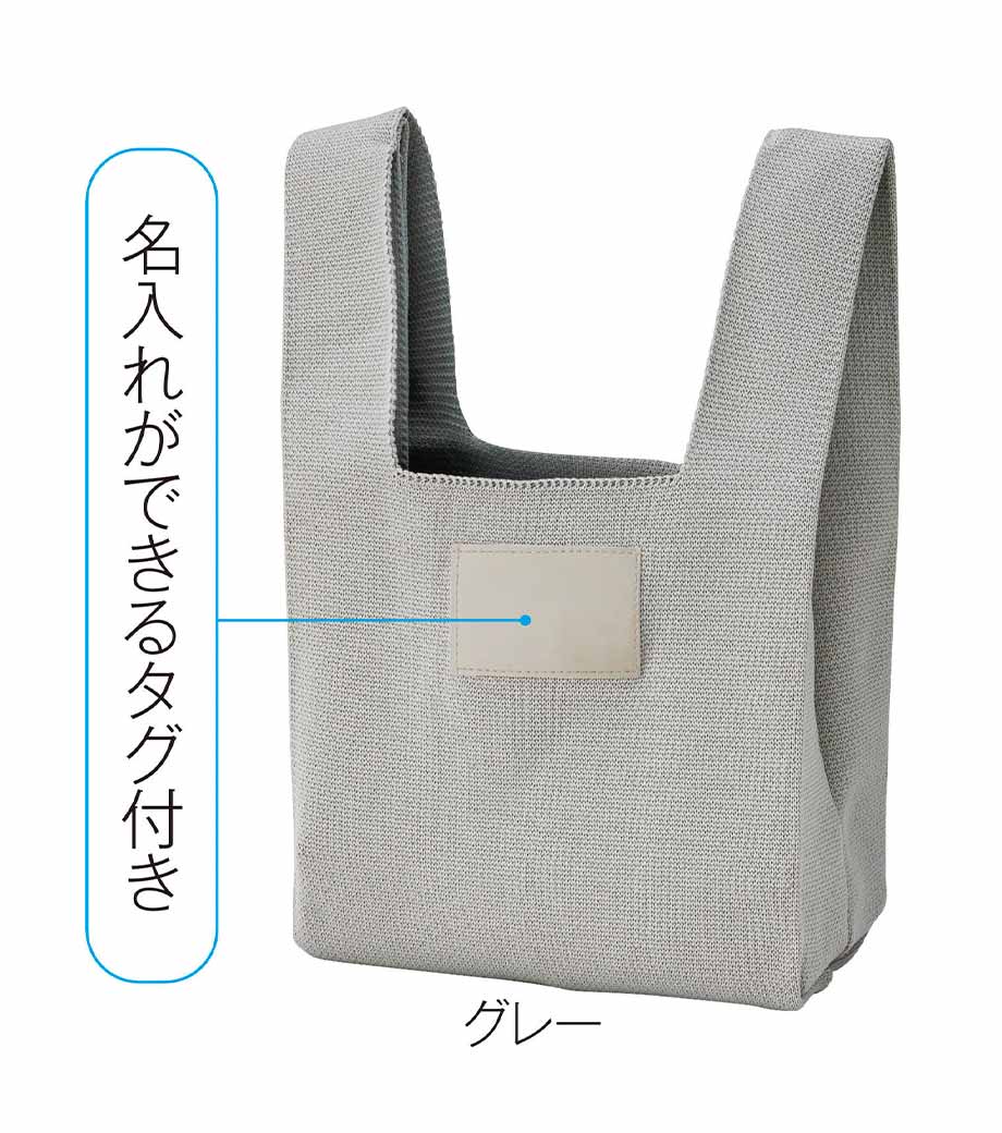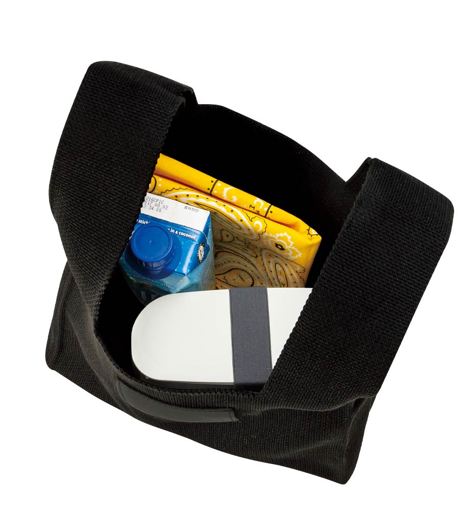 サイドは折りたたみマチなので、見た目以上にたっぷり入ります。縫いつけられているゴムバンドで名刺サイズに収納が可能。レジ袋と同じ形状だから、お弁当を入れる際にも安定感があり安心です。お仕事帰りのちょっとしたお買い物に重宝するサイズで、カバンに1つ入れておくと安心です。