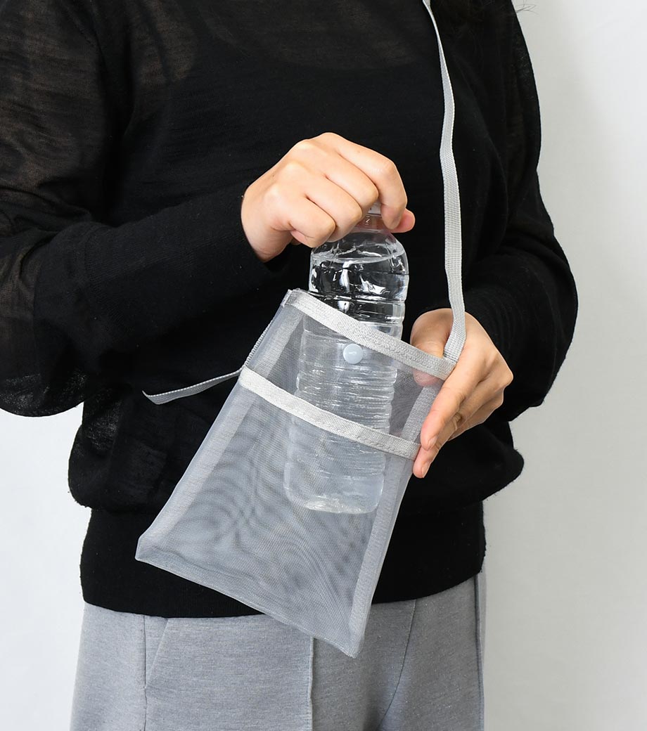 ボトルホルダーとしてもサコッシュとしても使える、便利な2WAYタイプ。内側には断熱効果の高いアルミ蒸着フィルムを使用しており、保冷効果があります。600mlのペットボトルがすっきり収まるサイズ感です。巾着の紐を締めれば、ペットボトルの飲み口部分をしっかり固定できるので、移動中の水分補給もスムーズ。外ポケット付きで、ショルダー部分は長さ調節・取り外しが可能です。