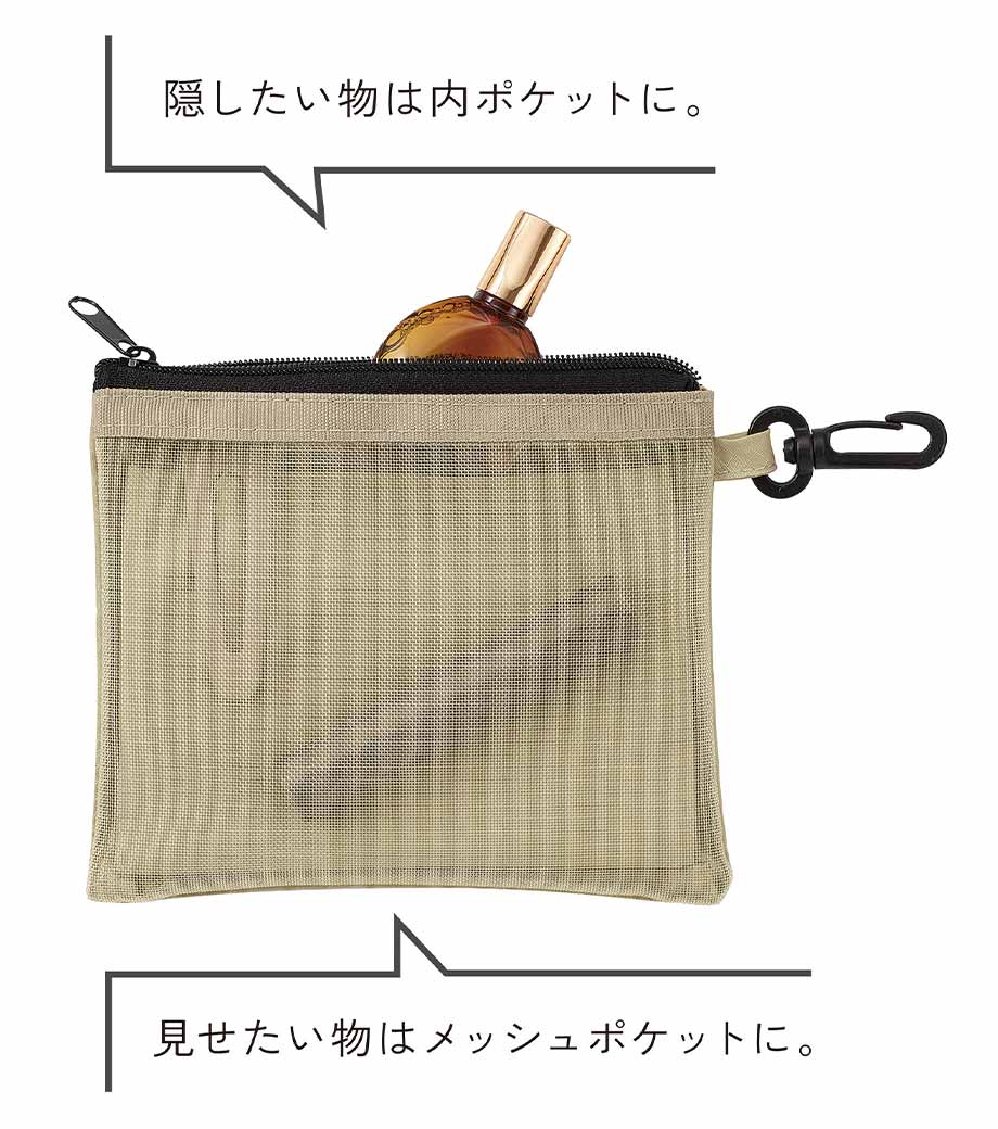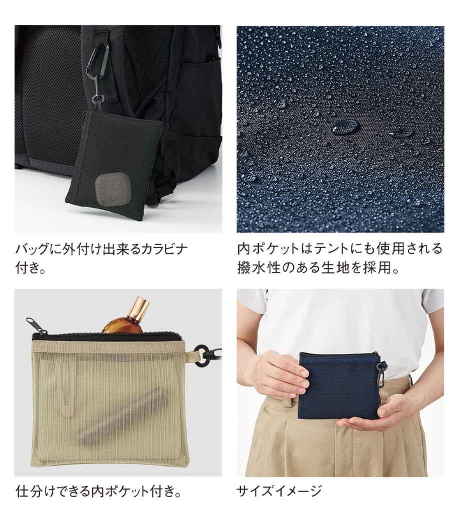 旅行や日常使いに最適なマルチポーチです。大きく開く設計で中身が一目瞭然、自立する形状と6つのメッシュポケットで整理整頓もスムーズ!フロントポケット付きだからサッと物を収納できて便利です。