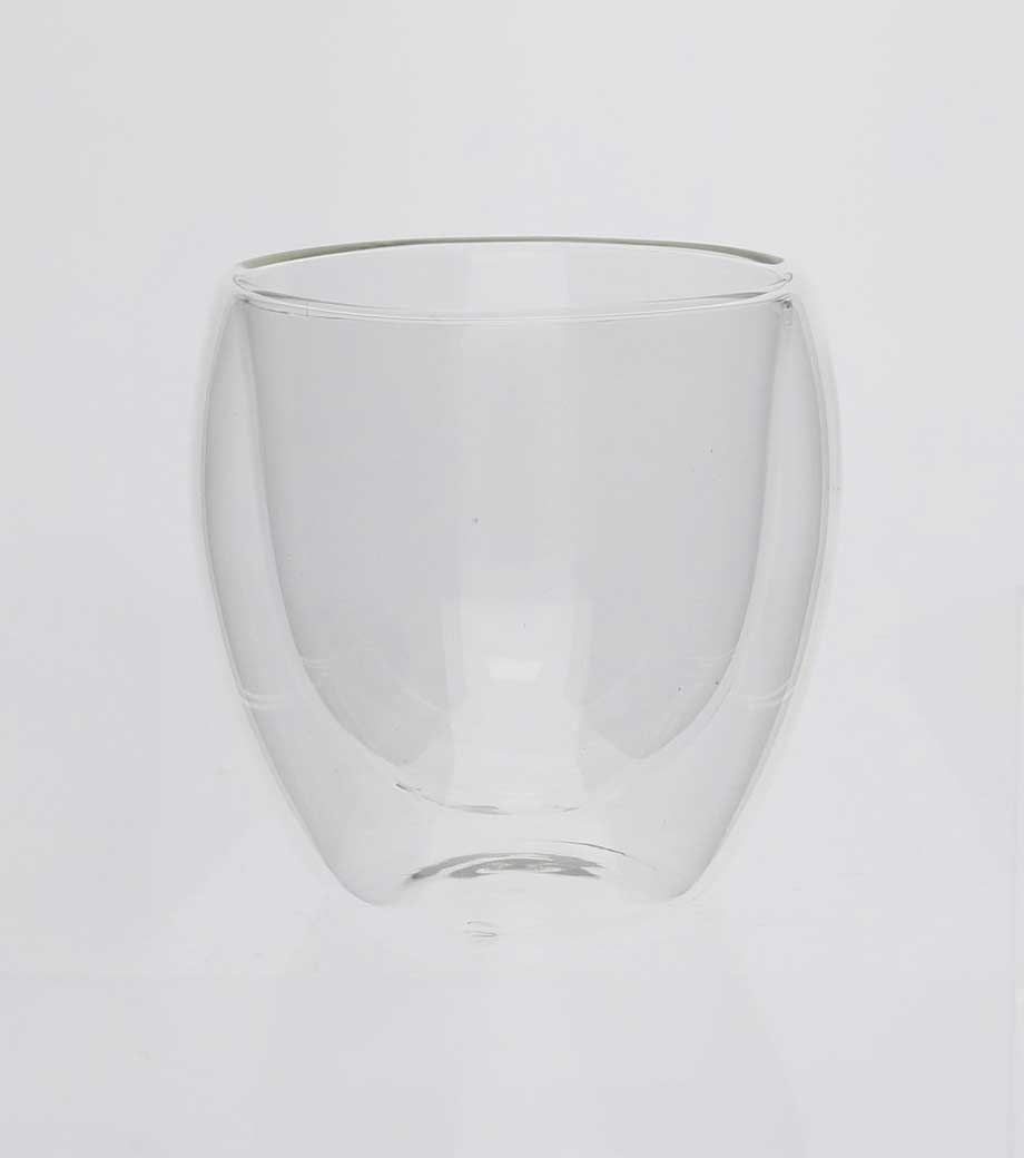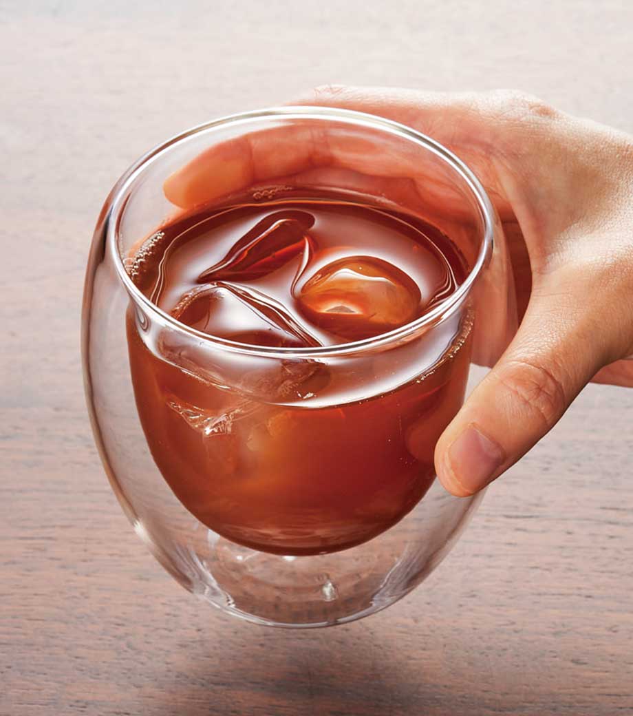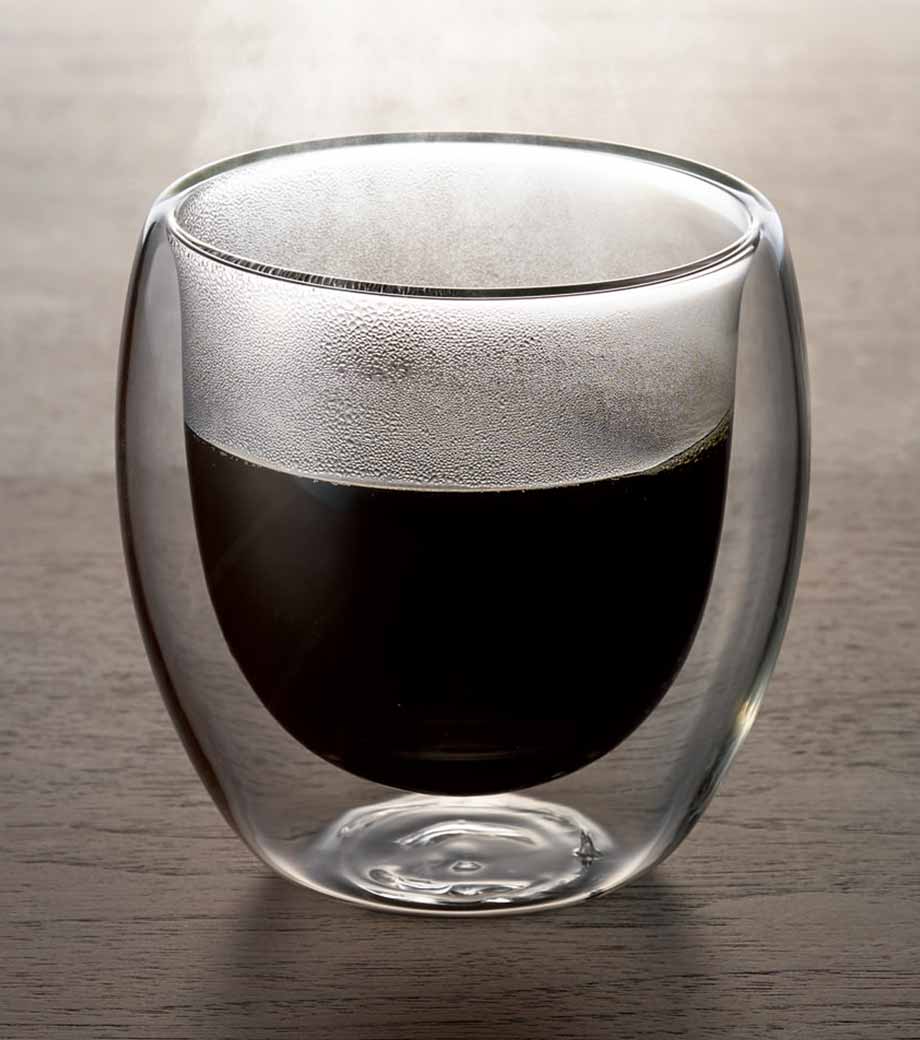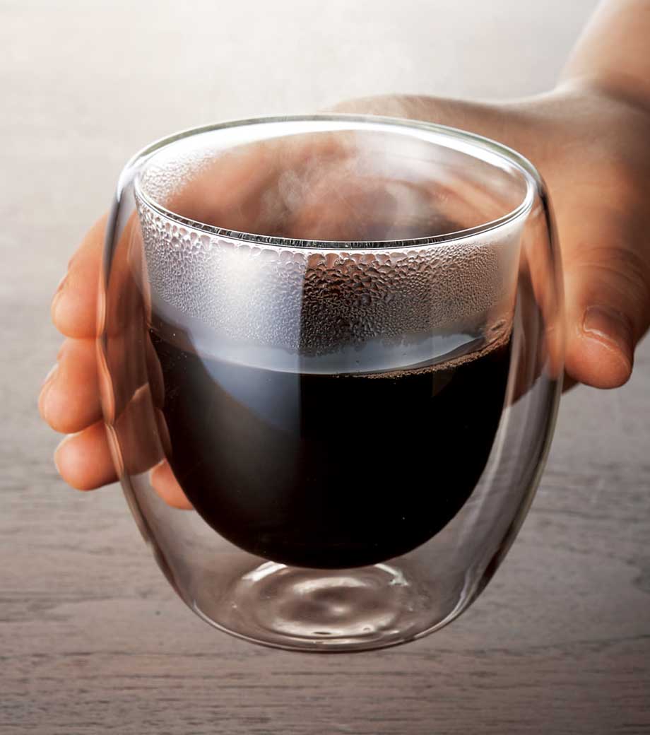 中に入れた飲み物が浮いたように見えるデザインが大人気のダブルウォールグラス。ホットドリンクも楽しめる耐熱タイプです。容量は約240mlで、コーヒーや紅茶を1杯楽しむのに丁度いいサイズ。二重構造だからアイスだと結露せず、ホットだとカップが熱くなりすぎず持ちやすいのがポイントです。広口設計で、デザートカップとしてもお使いいただけます。