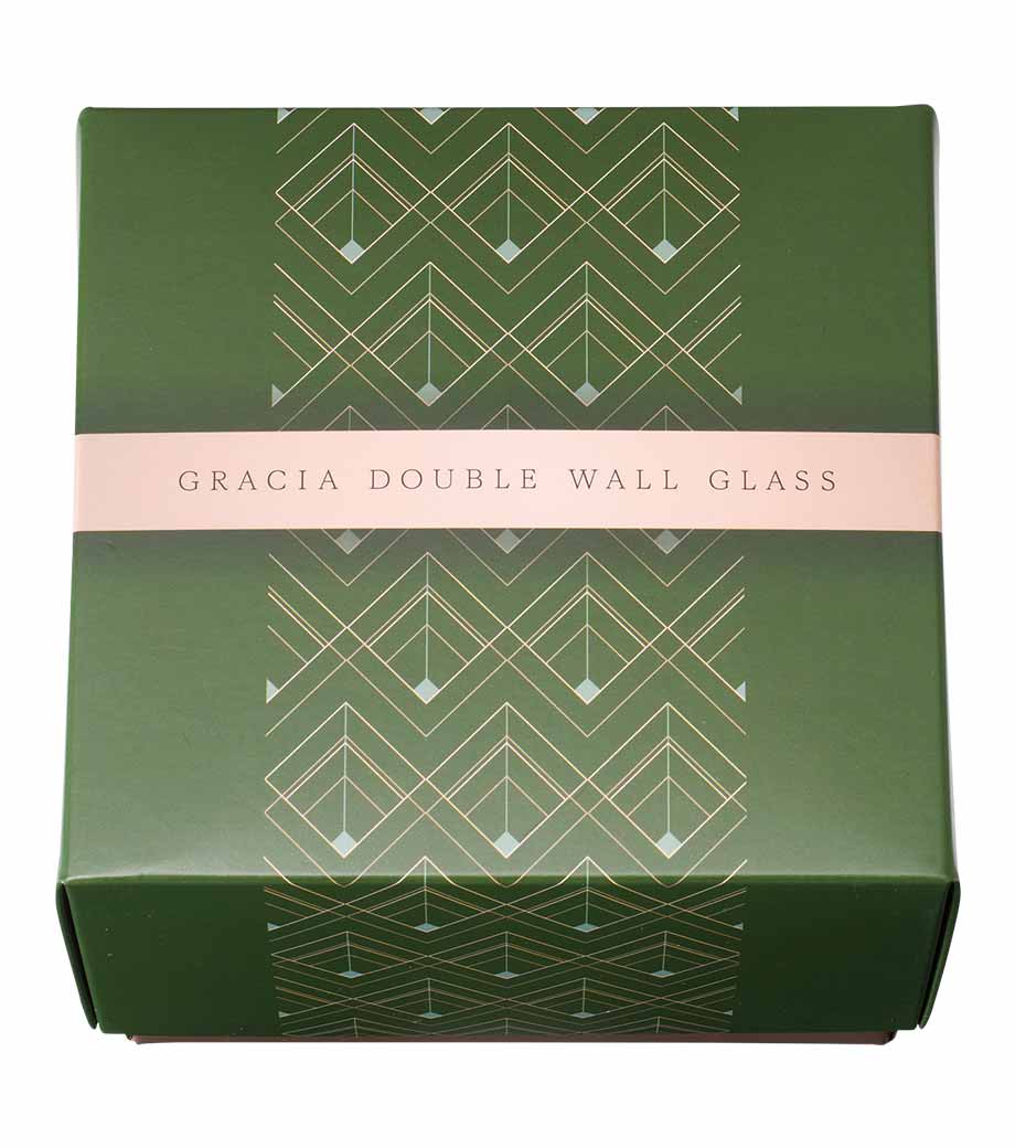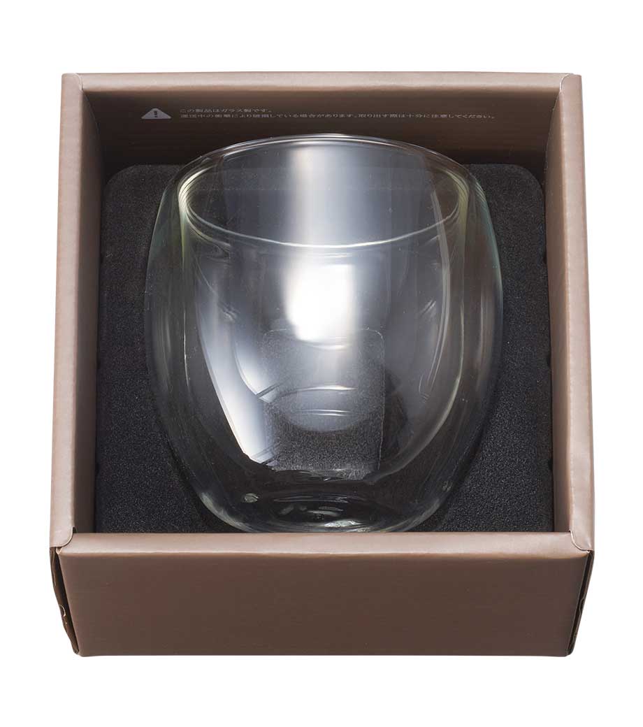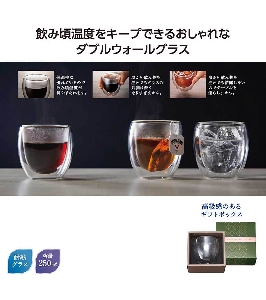 容量約250mlでブレイクタイムにぴったりサイズの耐熱グラスです。中空断熱構造で飲み物の熱さ・冷たさが手に伝わりにくいつくりになっています。結露もしにくくテーブルを濡らしません。高級感あるギフトボックス入りです。