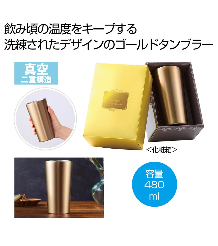 「金色(こんじき)のタンブラー&アイスストーンセット」は、品のあるゴールドのタンブラーと、テレビや雑誌で話題の飲み物を薄めず冷やせるアイスストーンのセットです。