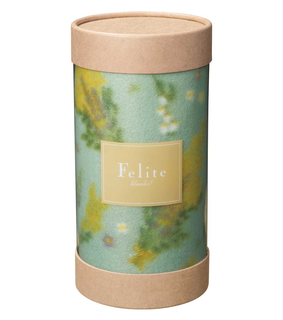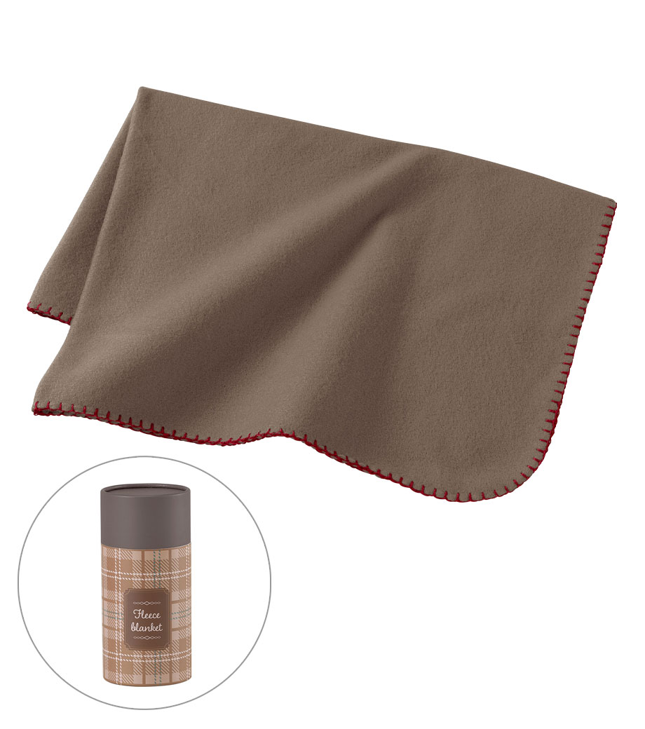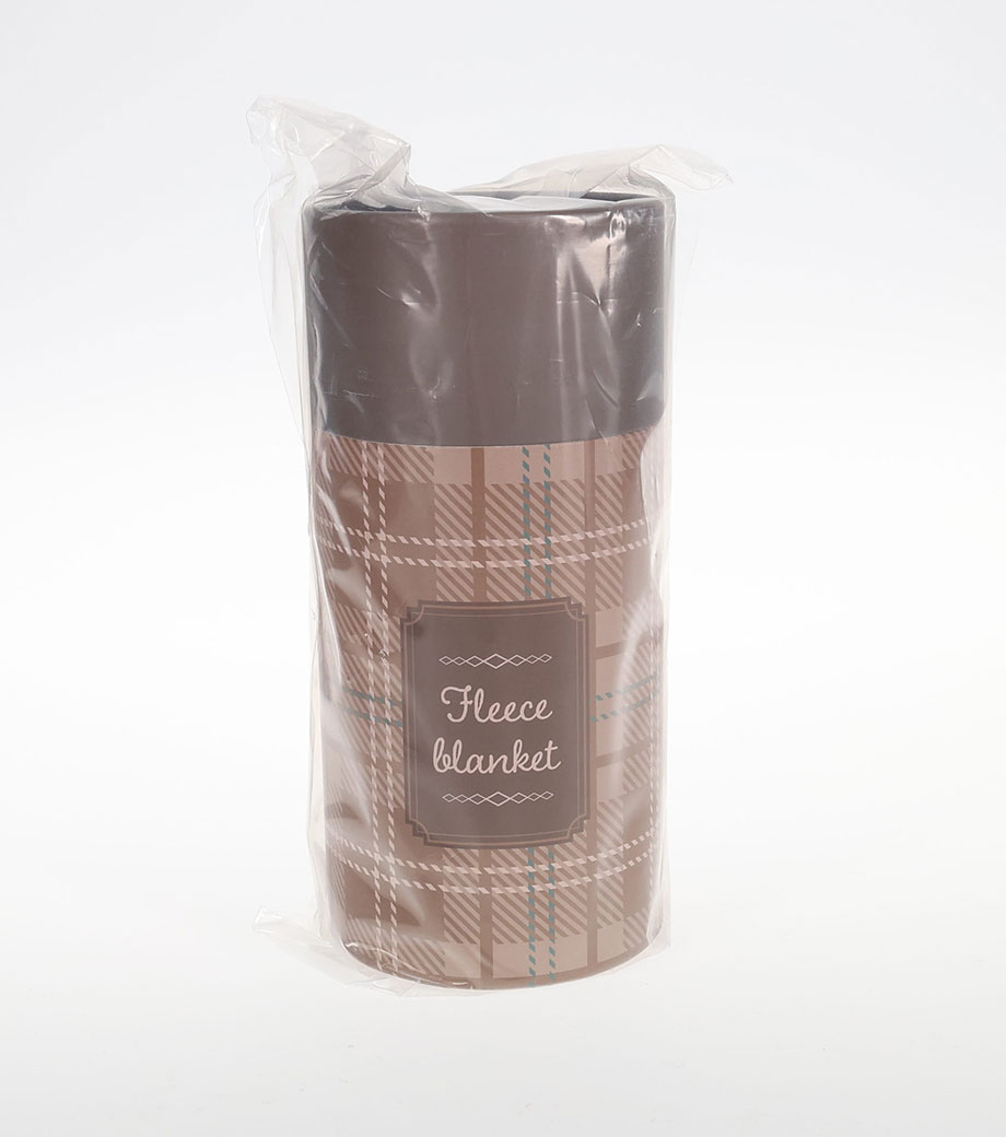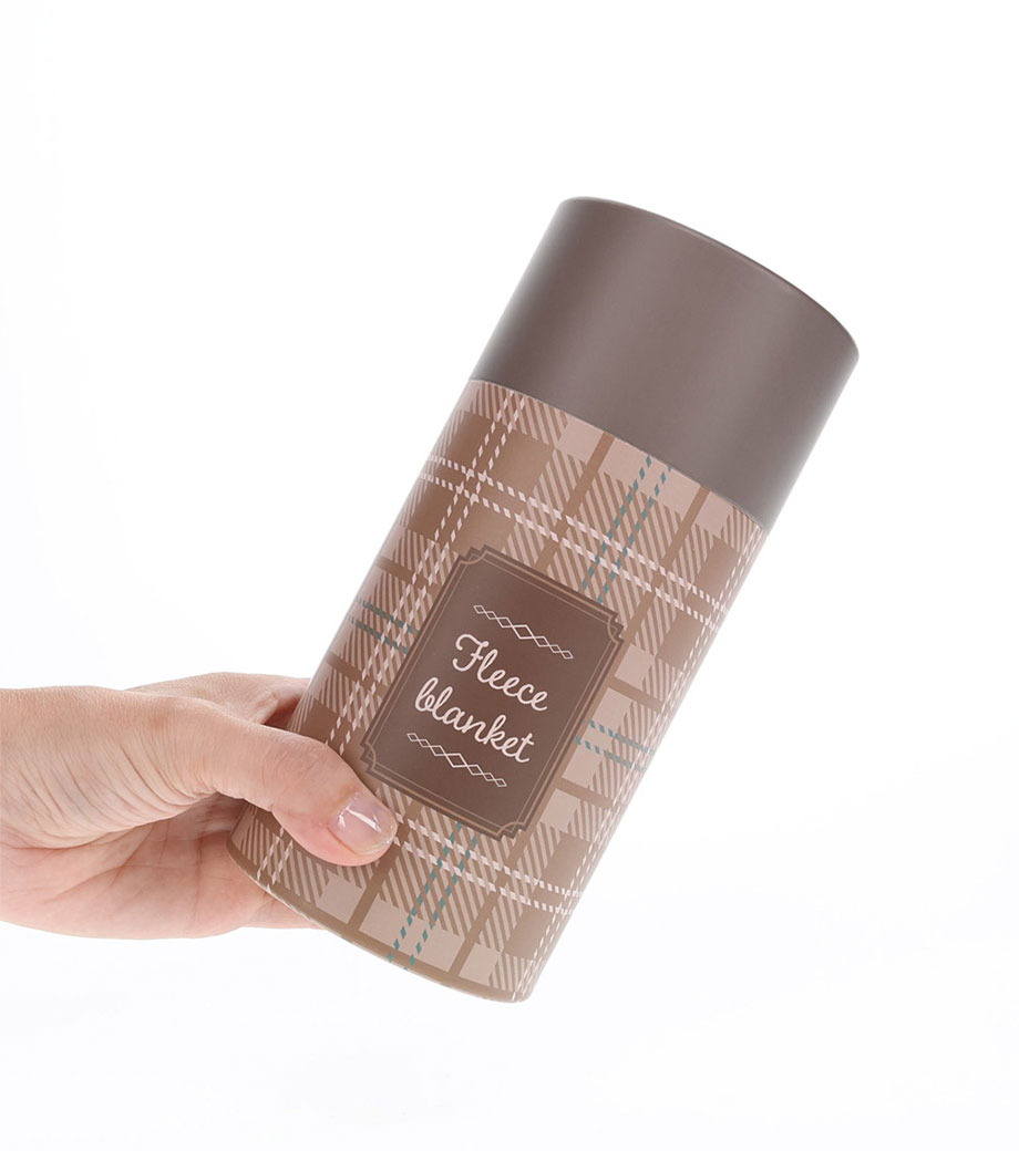 ゴールドの筒型ケース入りブランケット。展示会などでピラミッド型に積み上げれば、POP効果抜群!ブランケットは無地のグレーで誰もが使いやすい定番型です。ひざ掛けサイズでオフィスや自宅での防寒対策に。