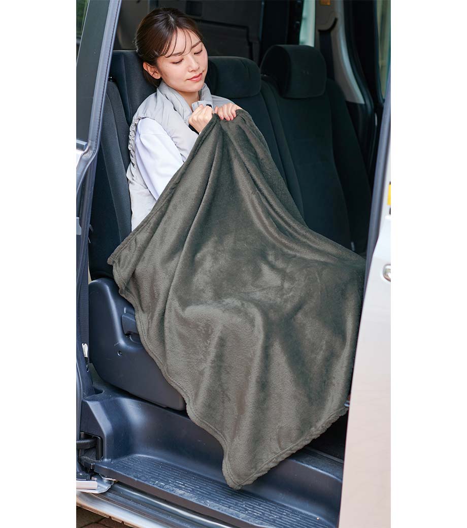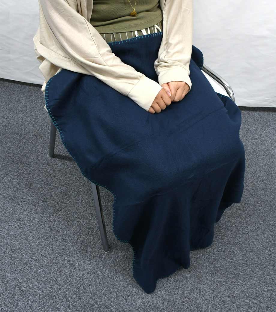 縦にすると、お腹から足元まですっぽり覆えるサイズです。お家でのリラックスタイムやオフィスでのデスクワーク、屋外でのアウトドアシーンなど、冬場の寒さ対策に一枚あると便利です。