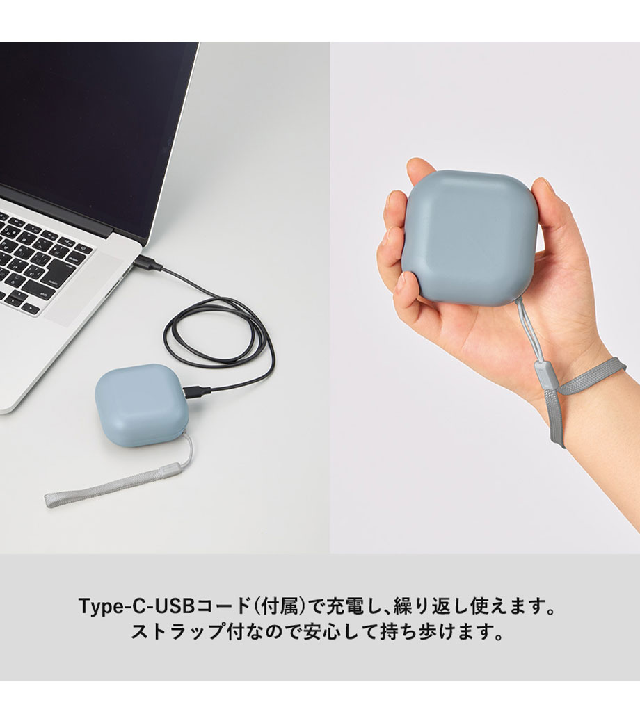 コロンとしたフォルムがかわいらしいカイロです。温度は約45度と約55度の2段階調整が可能。ストラップ付きで、持ち歩きにも便利です。両面が温まるので寒さ対策にぴったり!ベーシックなブラック・ホワイトに加え、くすみカラーがおしゃれなブルーの3色展開です。