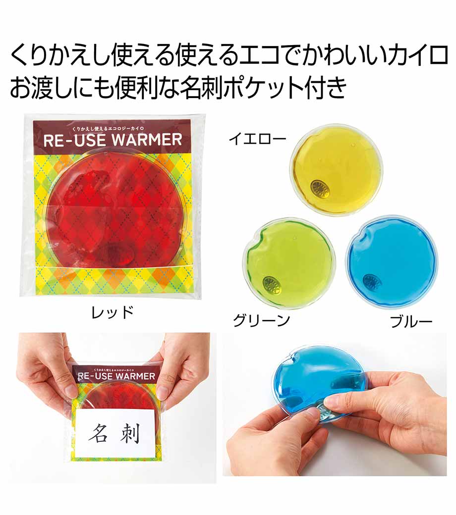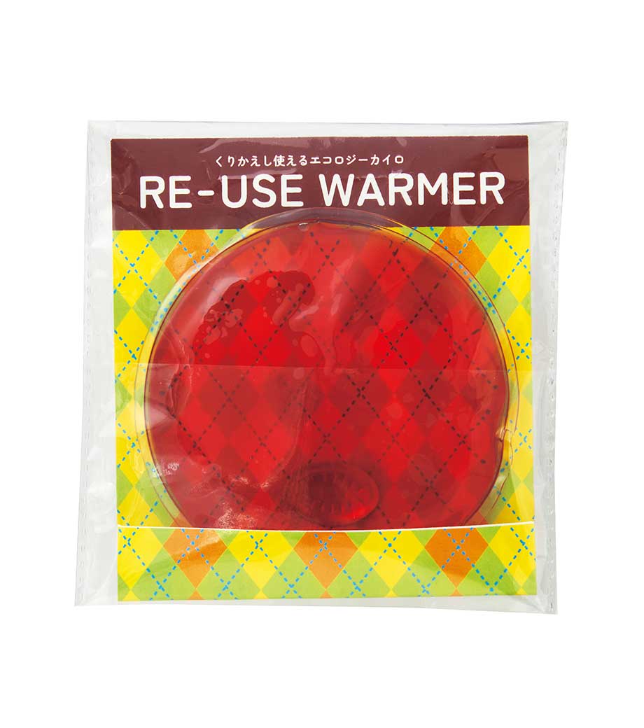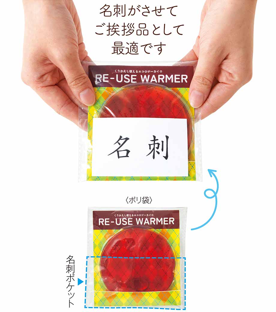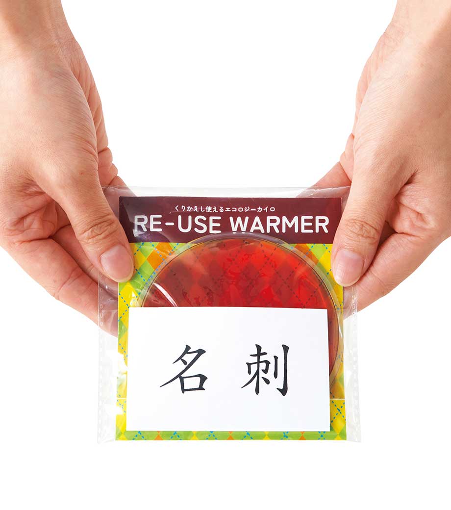 リサイクルエコカイロは繰り返し使えて環境にやさしいカイロ。中の金属片を数回パチパチ押し曲げると、ジェルが化学反応を起こし瞬時に温かくなります。暖かさは約30分持続します。使用後は熱湯で10分ほど煮沸し、冷水で冷やせば元通り。何度も再利用できます。