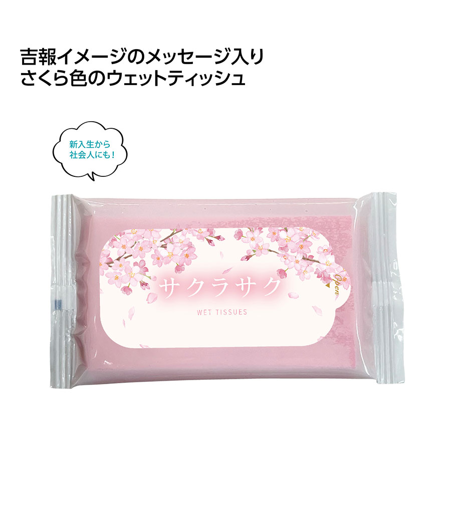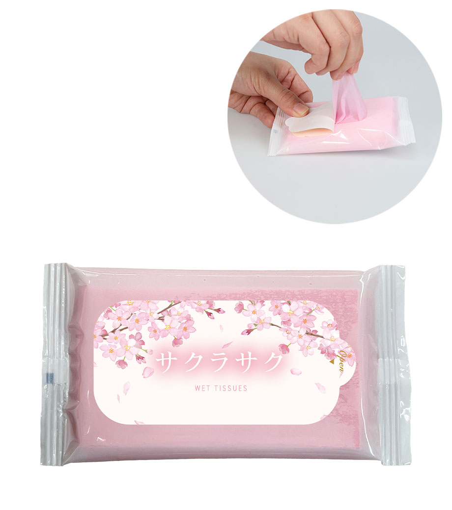 春らしいピンク色のパッケージに「サクラサク」の文字をあしらったウェットティッシュです。外出先での手拭きや食事前後はもちろん、通勤・通学時やお花見、イベント配布にもぴったり。学習塾でのプレゼントにもおすすめです。バッグに入れておくだけで、使うたびに春気分を感じられまる季節感のあるノベルティです。