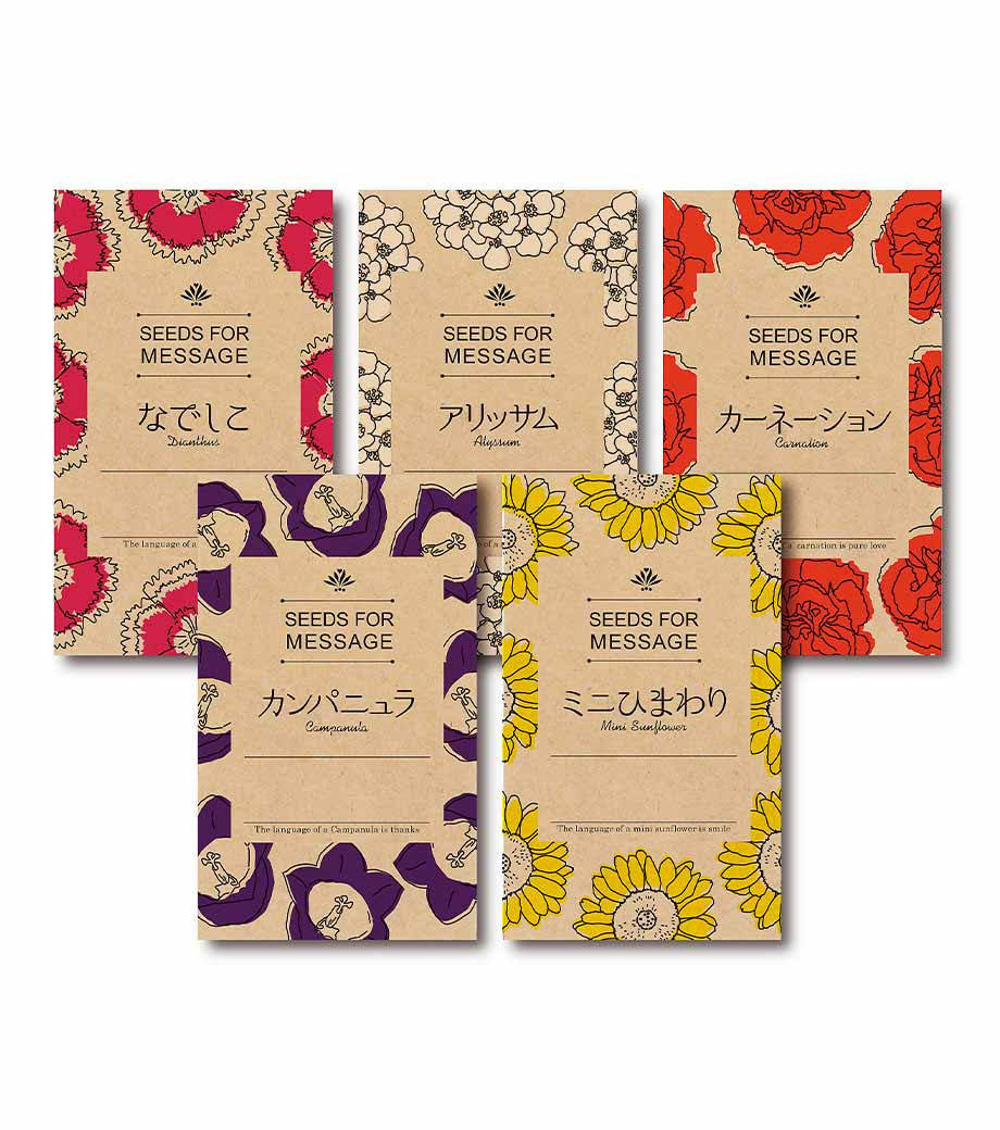 なでしこ、アリッサム、カーネーション、カンパニュラ、ミニひまわりの5種類の種を、温かみのあるクラフト紙のパッケージに収めました。おしゃれなイラストがポイントです。非常に安価でかさばらないため、大量配布や郵送ノベルティにも最適。女性向けイベントの来場特典やキャンペーンの景品として、季節を感じる「育てる喜び」をスマートに手渡せる人気アイテムです。