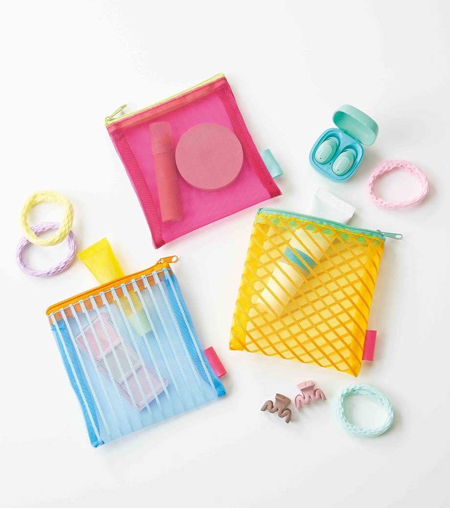 メッシュ素材のコンパクトポーチ。トレンドのカラーブロック配色がポップで可愛らしいアイテムです。メッシュ素材なので中身がひと目で確認でき、取り出しもスムーズ。リップやヘアゴムなどの細かなアイテム収納にぴったりサイズ。バッグの中でもかさばらないフラットタイプです。