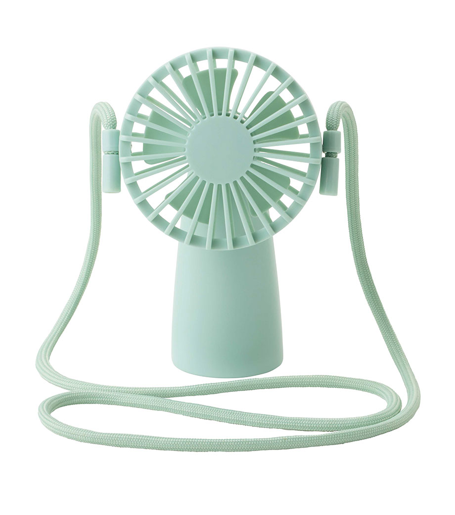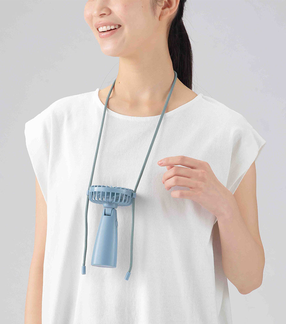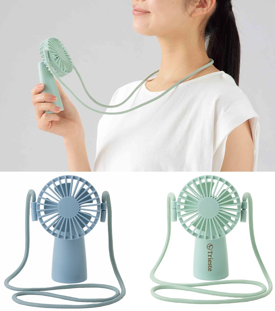卓上と首提げを2wayで使えるハンディファン。充電不要の電池式で、家でも外出先でも使えます。スイッチはスライド式の簡単仕様。付属のネックストラップは長さ調節が可能です。くすみカラー2色を取混ぜでお届けします。