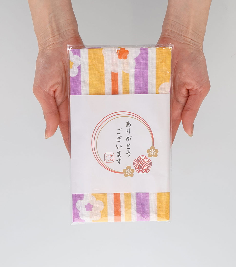 縞模様に小梅の柄をあしらった、上品で親しみやすいてぬぐいです。日本らしい伝統文様は、年齢や性別を問わずお使いいただけます。「ありがとうございます」のメッセージが印字された熨斗付き。ご挨拶や感謝の気持ちを伝えるお礼の品としてもおすすめのノベルティです。