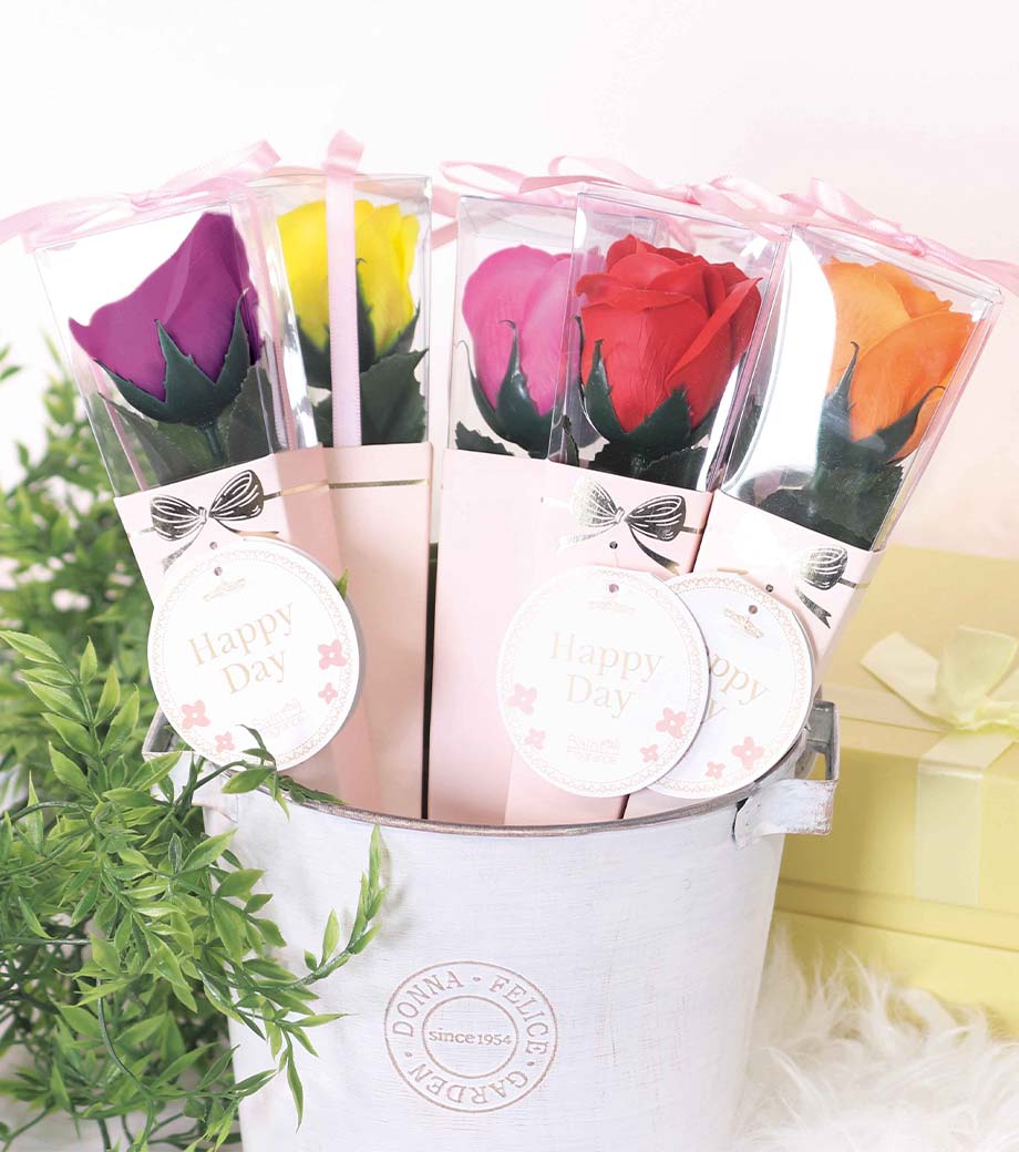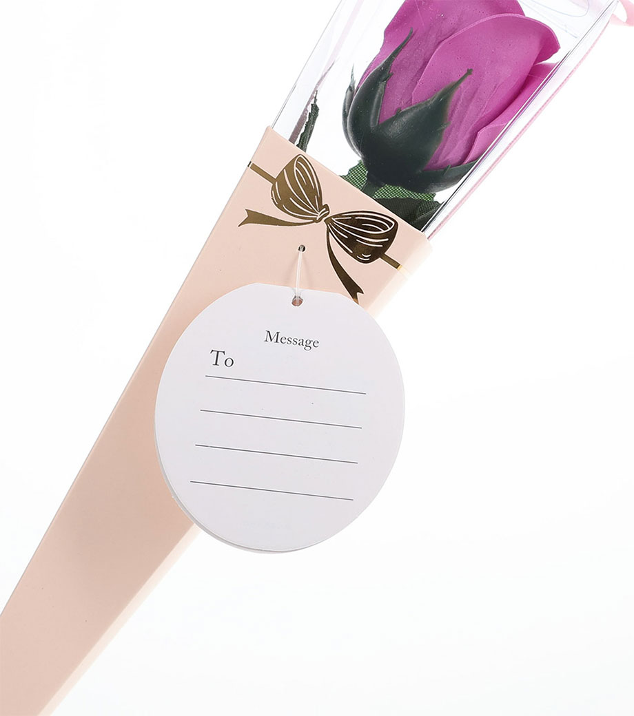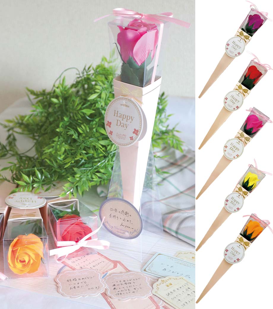 華やかな5色取混ぜでお届け。しっかりとした透明ケース入りで、タグの裏はメッセージカードとして使用できます。そのまま渡せるギフト品質も嬉しいポイント。ウェディングの送賓ギフトや、女性向けイベントのノベルティにおすすめ。「わあっと驚く笑顔」を演出できる、センスの光る一品です。