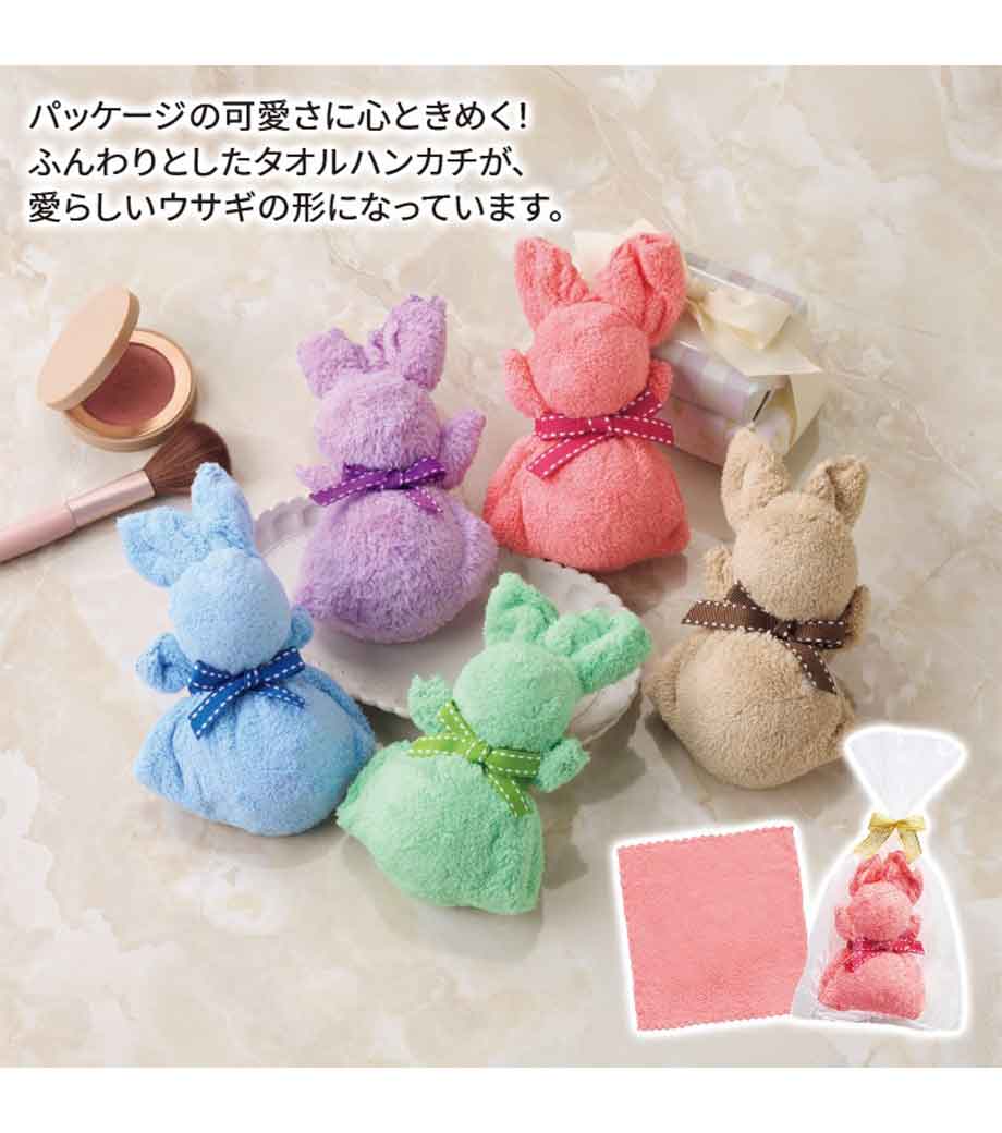 愛らしいウサギ型にアレンジされたプチギフトタオル。広げるとハンカチタオルとして使えます。マイクロファイバー素材で使い心地ふんわり。パッケージはリボン付きの袋入りなので、そのまま配布できます。ディスプレイでたくさん並べると可愛さも相まって注目度バツグンです。ファミリーイベントでのばらまきや商業施設のキャンペーンなどにおすすめ。小さなお子さまにも喜ばれるアイテムです。