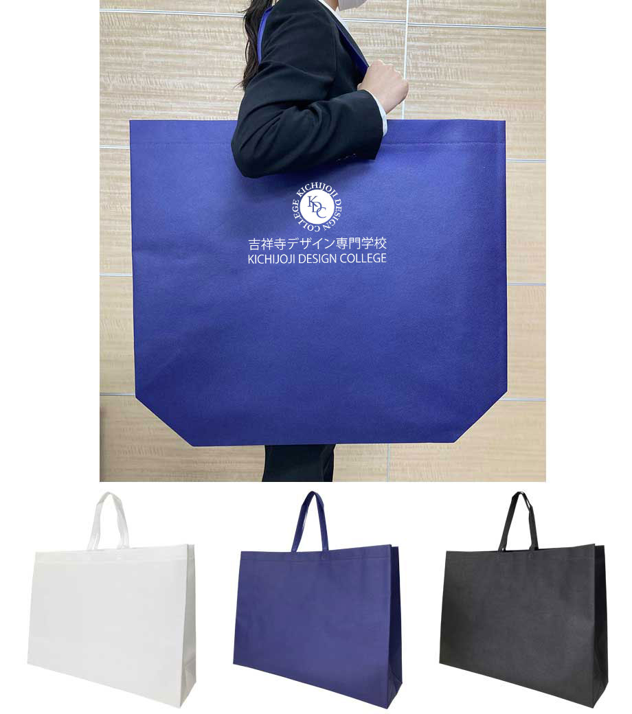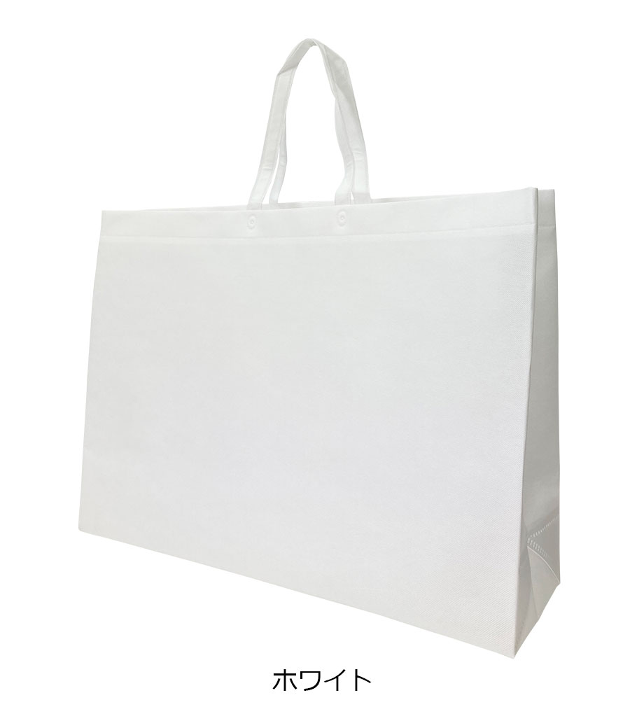 名入れが目立つ超特大サイズの横長不織布バッグです。肩掛けできる長めのハンドル。約180mmと広め角マチで大きなパネル等もたくさん収納できます。絵画や額装、展示会・アパレルのショッパーなど大きな荷物を持ち運ぶ時に大活躍!ランドリー用バッグにもオススメです。