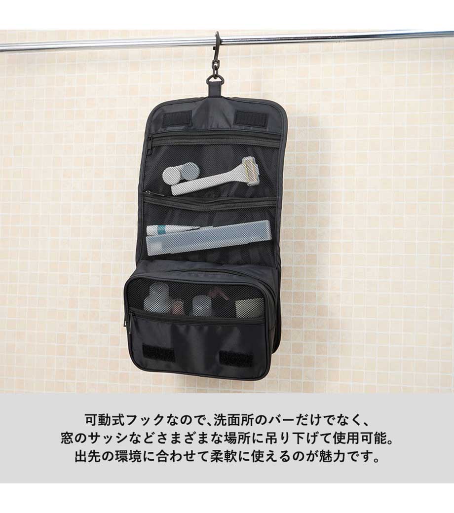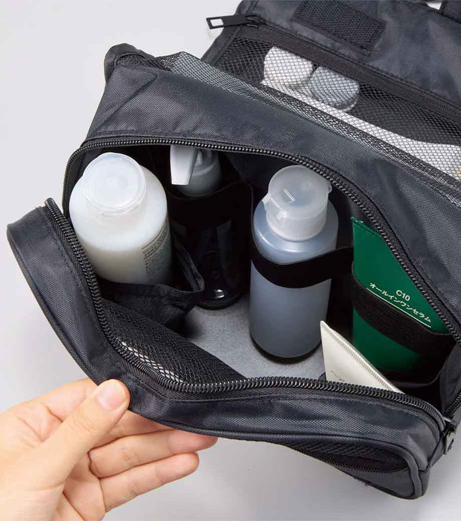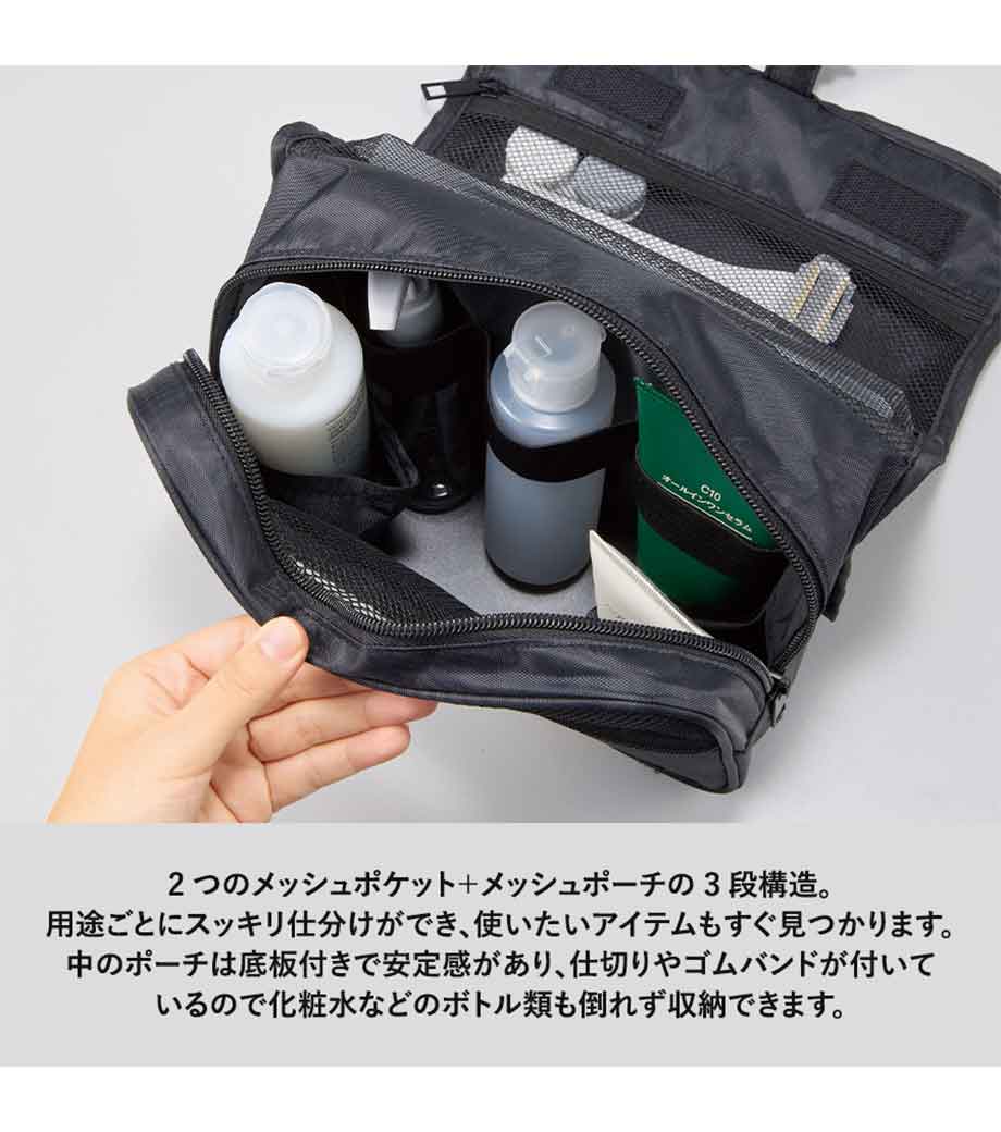 普段使いの洗面用具などが一式入るトラベルポーチです。化粧品のボトルがそのまま入るような余裕のあるサイズ感で出張や旅行にもぴったり。上部にメッシュポケットが2つ、下部はメッシュポーチに分れており、用途別に仕分けできます。ポーチの中は底板付きで、仕切りやベルトもありスッキリ収納。前後に付いた外ポケットにはマスクやミラーなどを入れられ便利です。