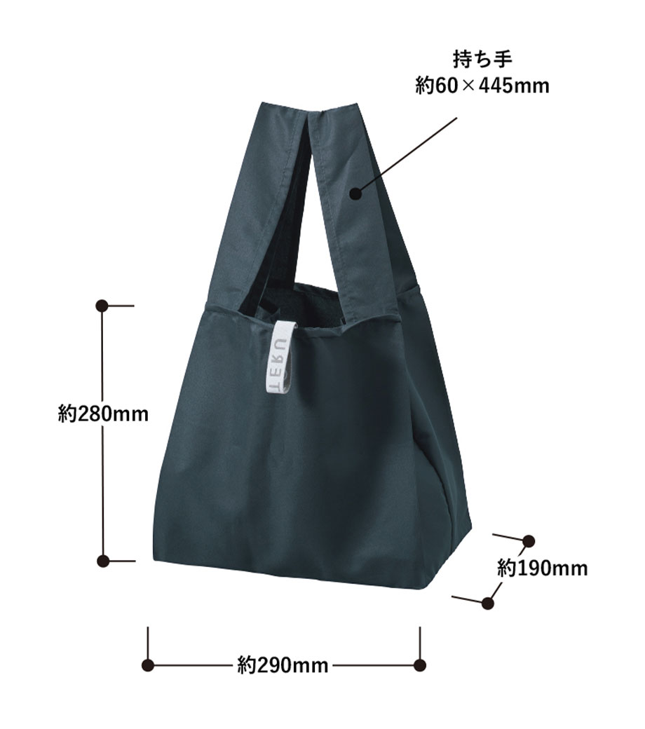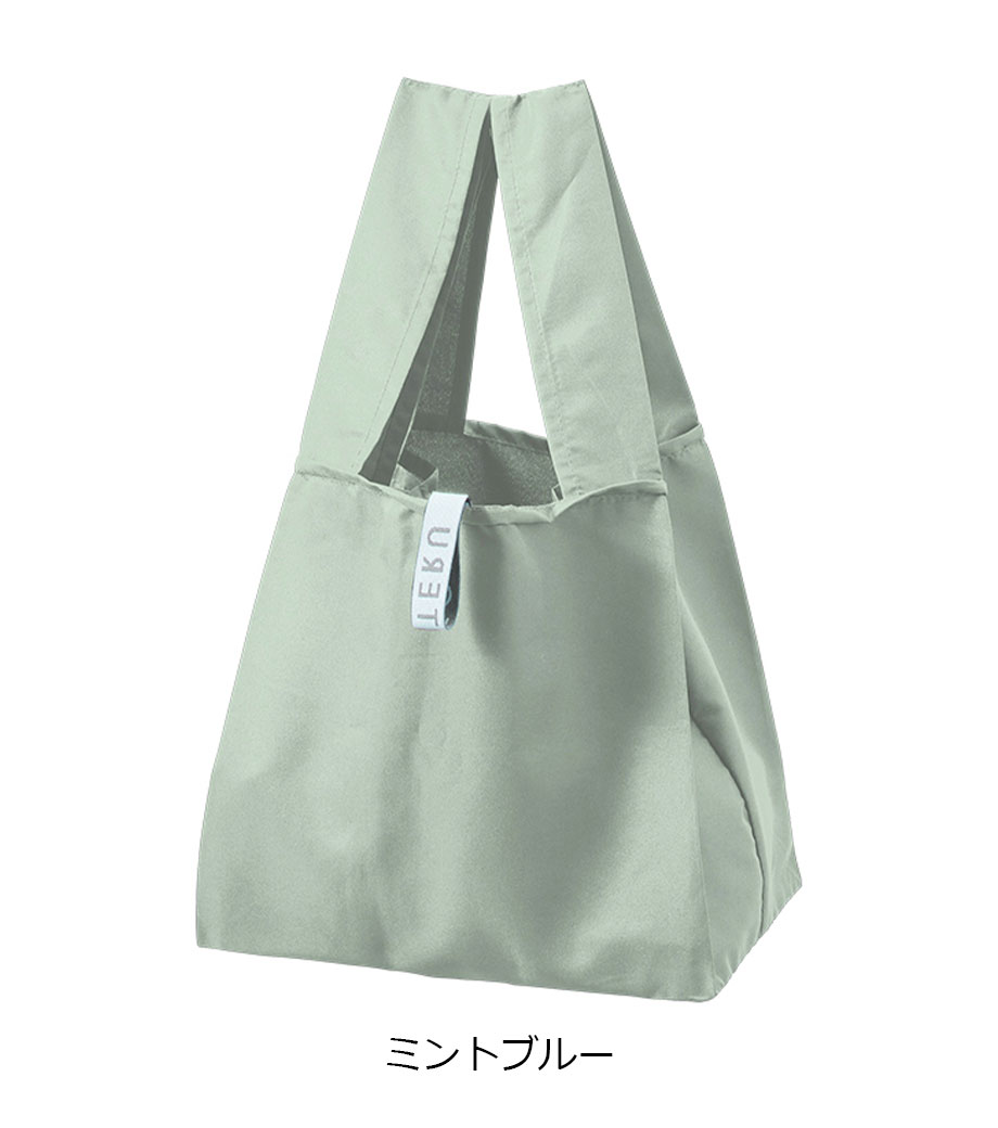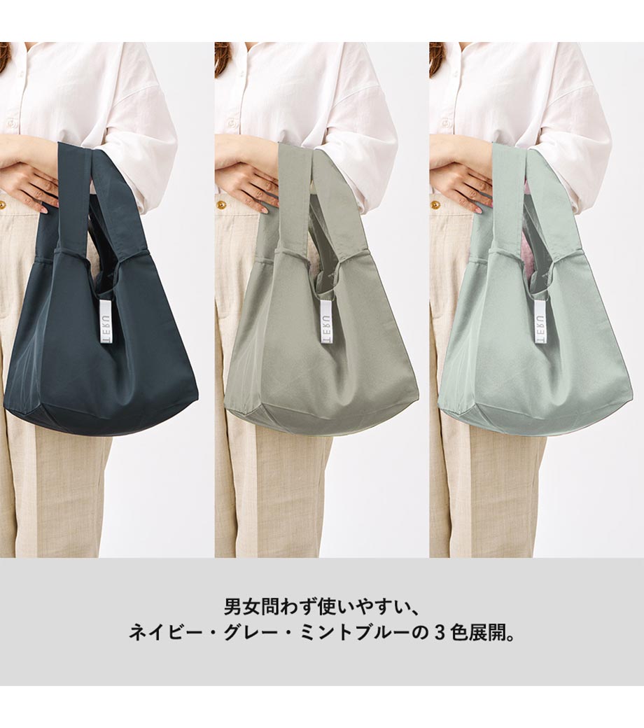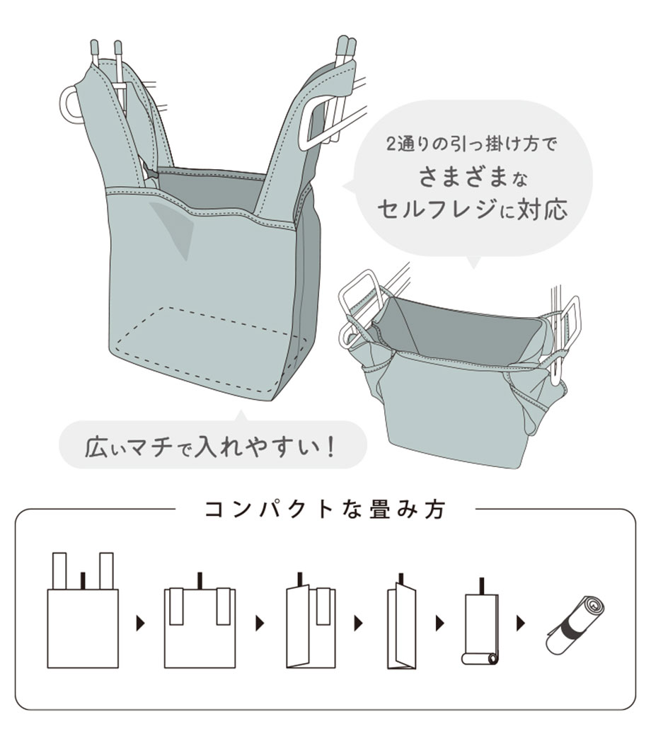 セルフレジでの使用に適したスクエア型エコバッグ。畳んでゴムバンドで留められるため、かさばらずコンパクトに持ち歩けます。持ち手はセルフレジのバーに引っ掛けて使用でき、バーが低い場合でも内側の紐を使ってセットできます。広めのマチで安定感があり、食品が入れやすいのもポイント。ネイビー、グレー、ミントブルーのカラー展開。
