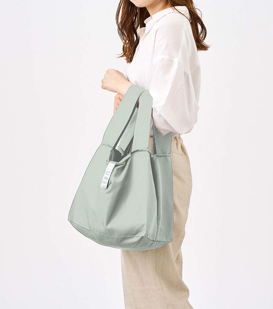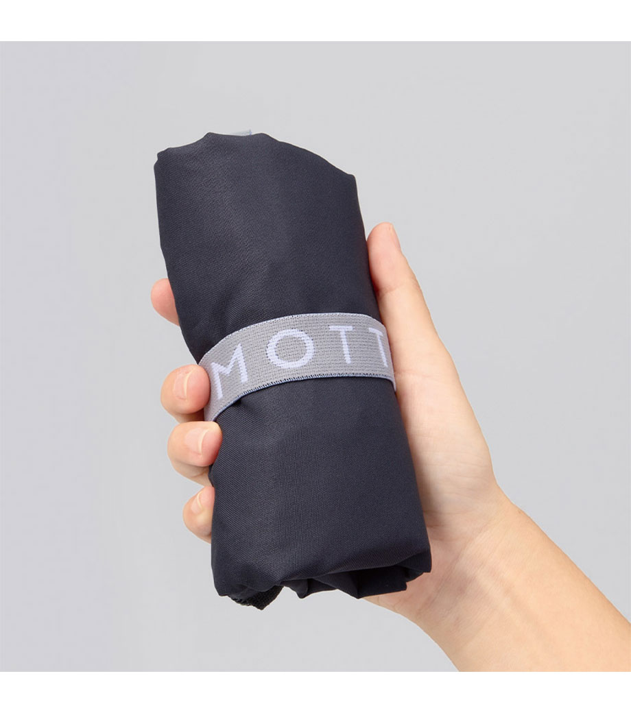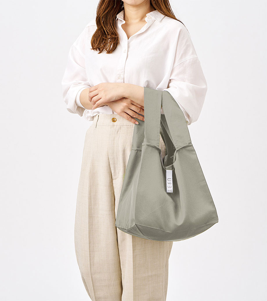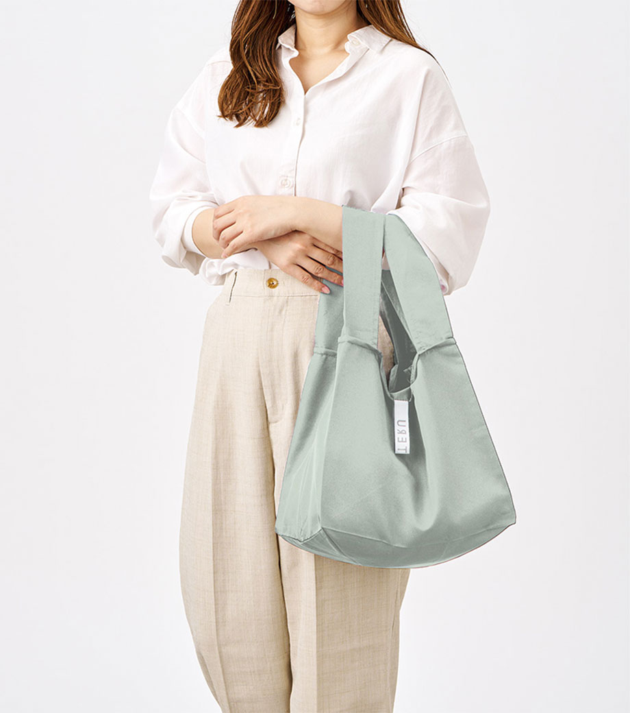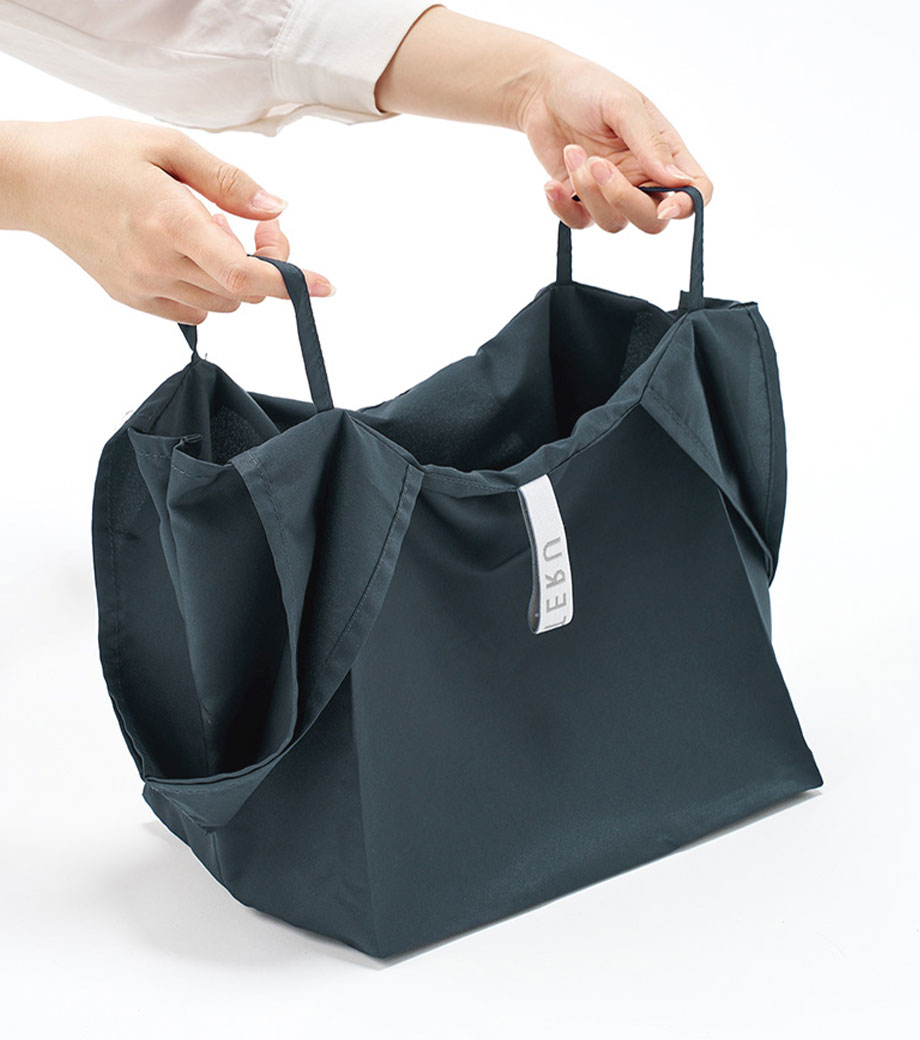 セルフレジでの使用に適したスクエア型エコバッグ。畳んでゴムバンドで留められるため、かさばらずコンパクトに持ち歩けます。持ち手はセルフレジのバーに引っ掛けて使用でき、バーが低い場合でも内側の紐を使ってセットできます。広めのマチで安定感があり、食品が入れやすいのもポイント。ネイビー、グレー、ミントブルーのカラー展開。