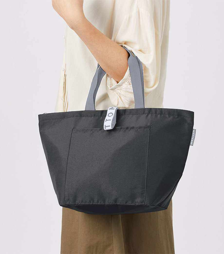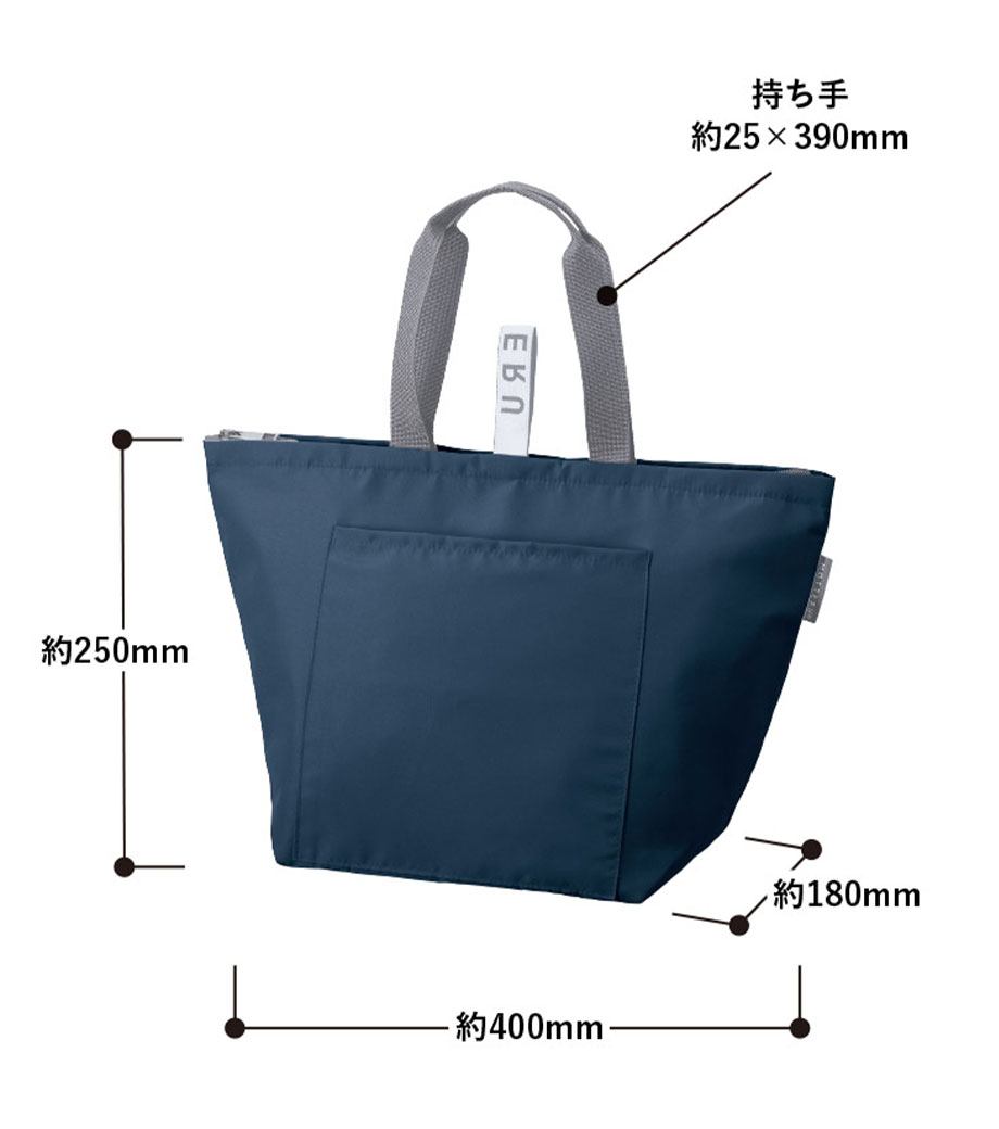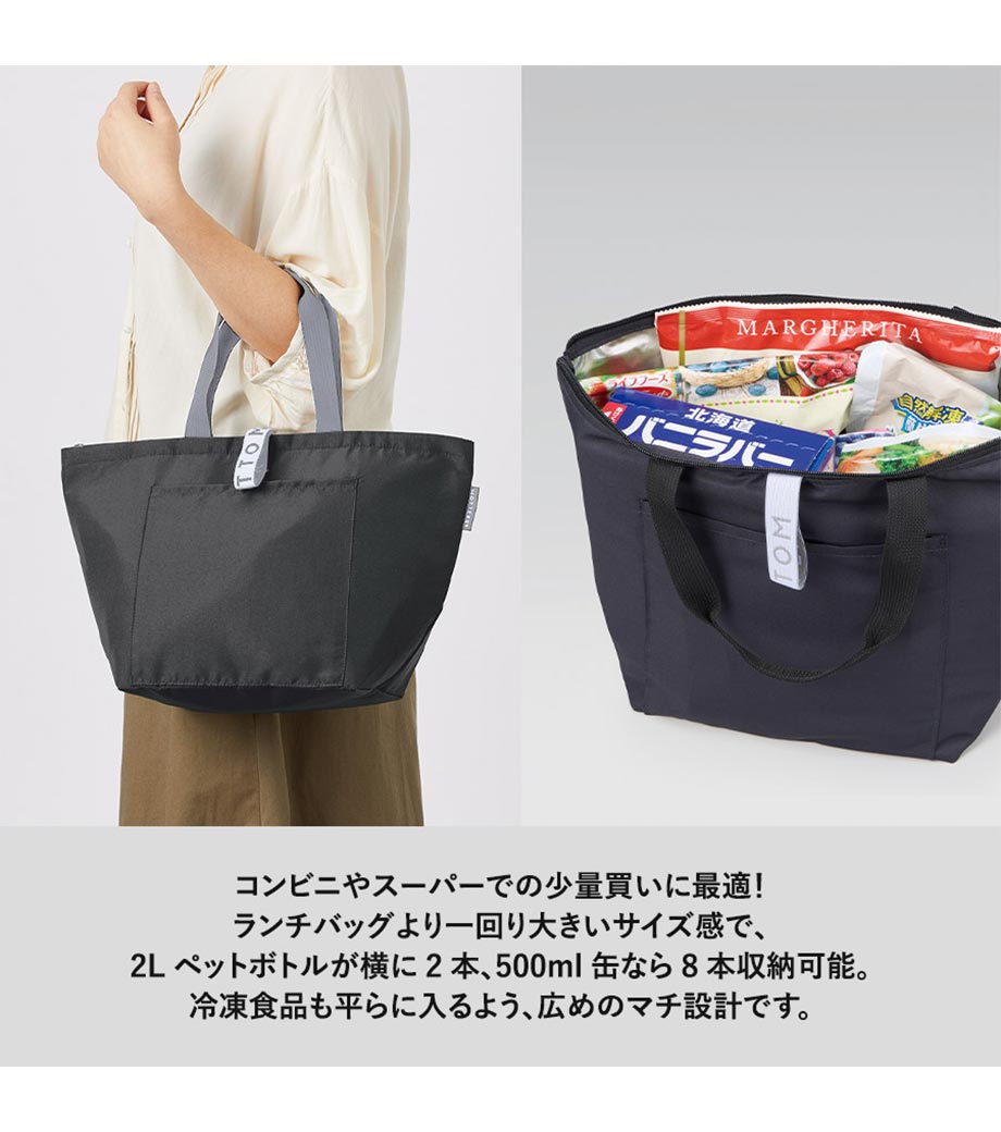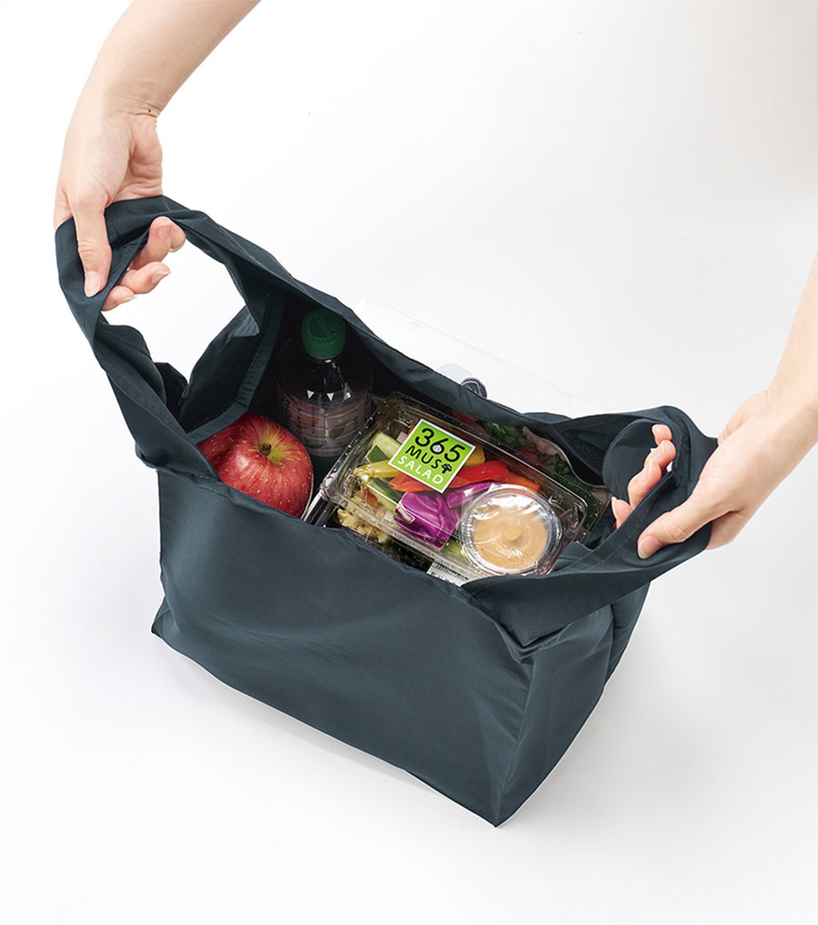 平日のコンビニやスーパーで少量買いするのにぴったりな保冷エコバッグ。ランチバッグより一回り大きいサイズで、コンパクトながら2Lペットボトル2本や500ml缶8本が収納できます。冷凍食品も平らに入れられる広めのマチ設計。使わない時は小さく折り畳め、洗濯機で洗える点も魅力です。