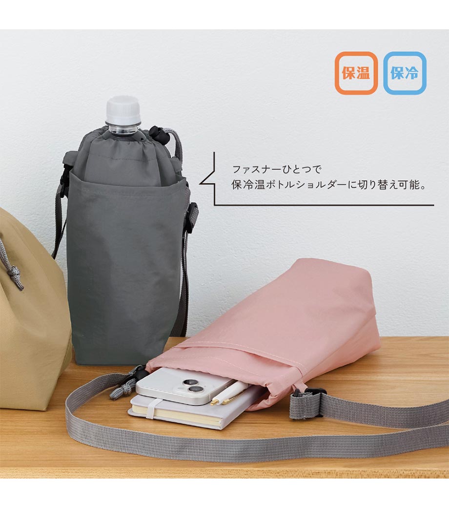 コンパクト保冷温ショルダーは、500mlペットボトルが2本入る大きさの保冷温機能付きバッグ。両手があくショルダータイプの保冷温バッグは毎日のお出かけや旅行、イベントで大活躍!ファスナー式なので中身が飛び出る心配もありません。外側についているメッシュ製フロントポケットはスマホやチケットの収納にぴったりです。長さを調整できるストラップを取り外せばポーチになります。
