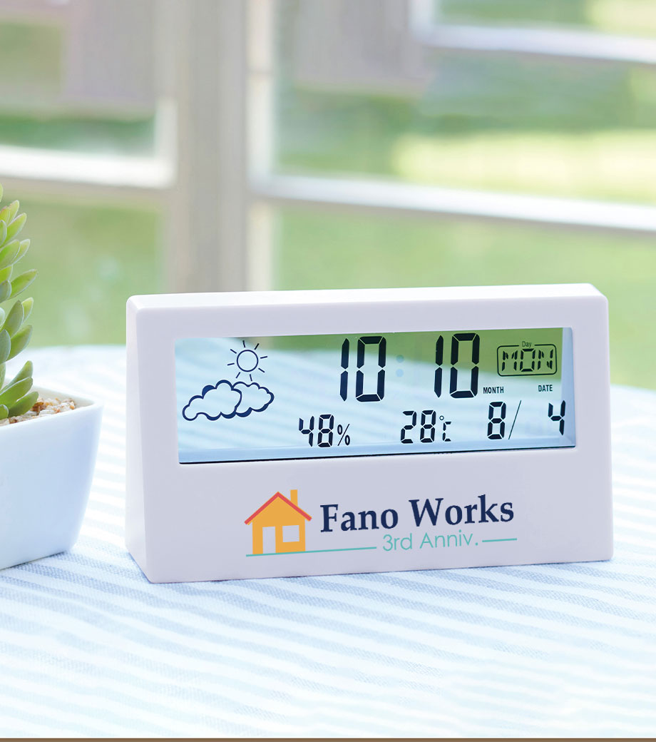 フレームはシンプルなホワイトで、印刷が映えます。目につく時計画面のすぐ横に、名入れができます。学校名や企業名を入れて、卒業記念や周年記念に人気のお品です。クラブやクラス、会社の思い出の集合写真をお仲間と共有できますね。時刻のほか、温度や日付を表示してくれ、アラームやスヌーズ機能も充実しています。
