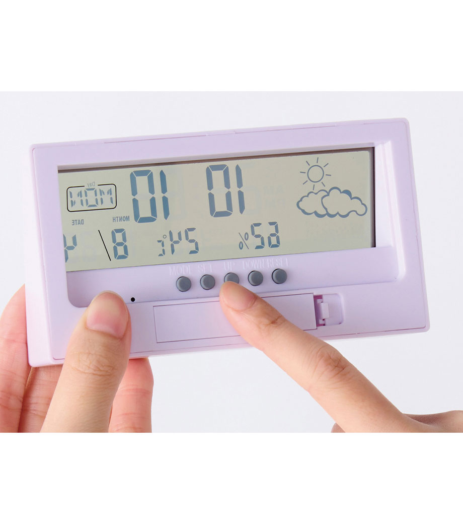 時計・タイマー・アラーム・温度計機能が1台につまったデジタル時計。本体を回転することで機能を切り替えられます。コンパクトなので置く場所に困りません。ぱっと見で機能を判断できるマーク付きで、世代を問わずお使いいただけます。