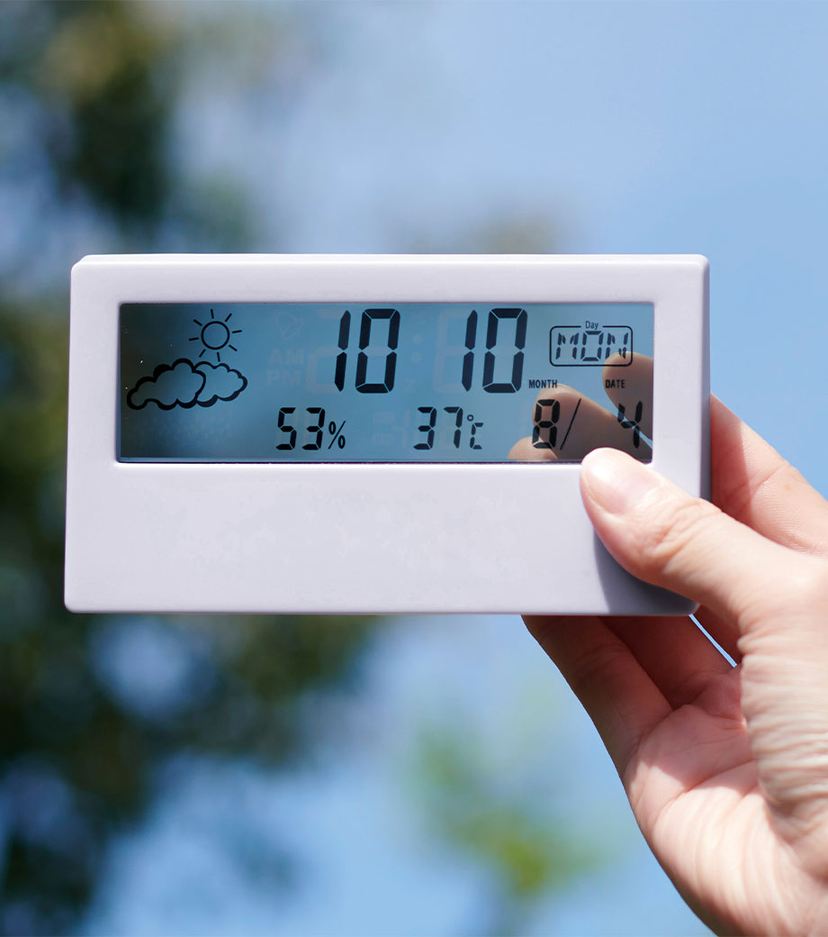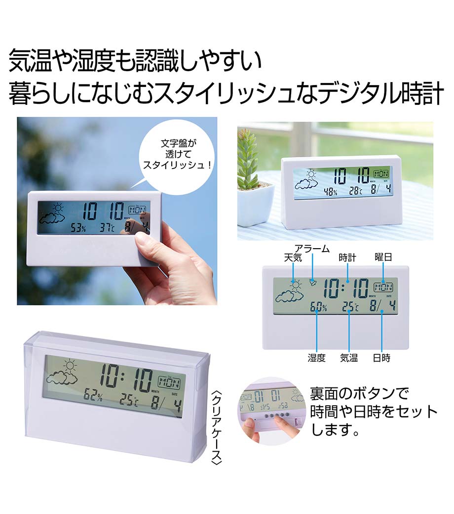 遠くからでも数値がわかりやすいビックサイズの文字表示で、時刻の表示はもちろん日付や曜日、温度がひと目でわかります。