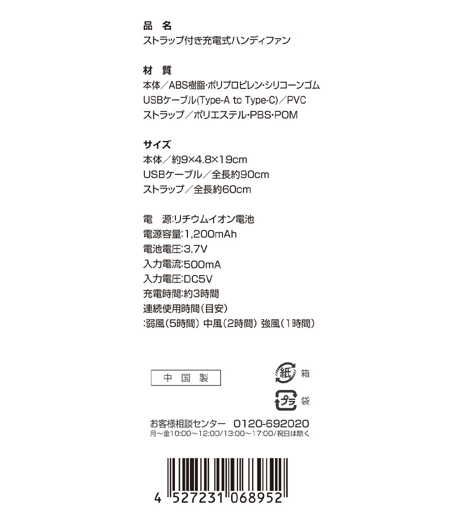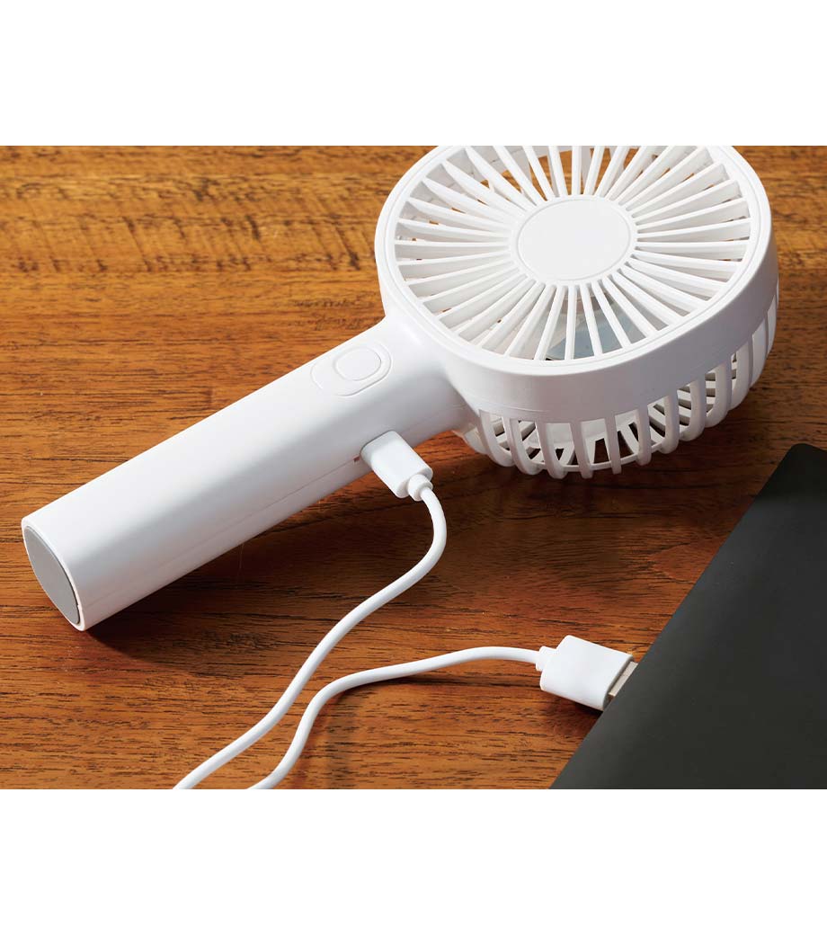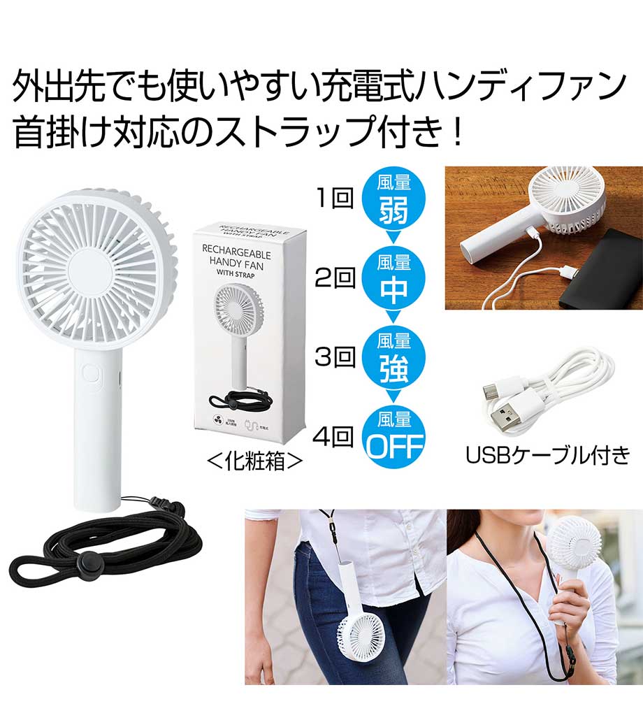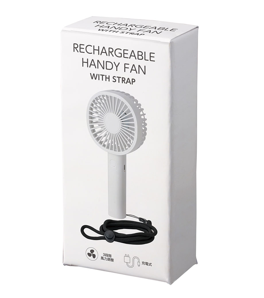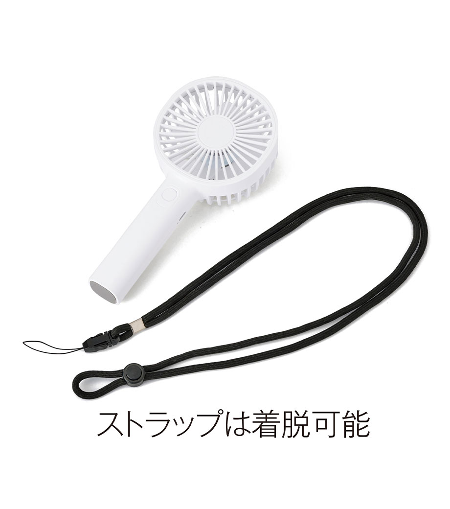 USB充電式で手軽に使えるハンディファンです。風量はボタンを押して3段階に調整できます。ストラップ付きなので外出先でも使いやすく、通勤・通学からレジャーシーンまで幅広く活躍。シンプルなデザインで年代性別問わず喜ばれます。