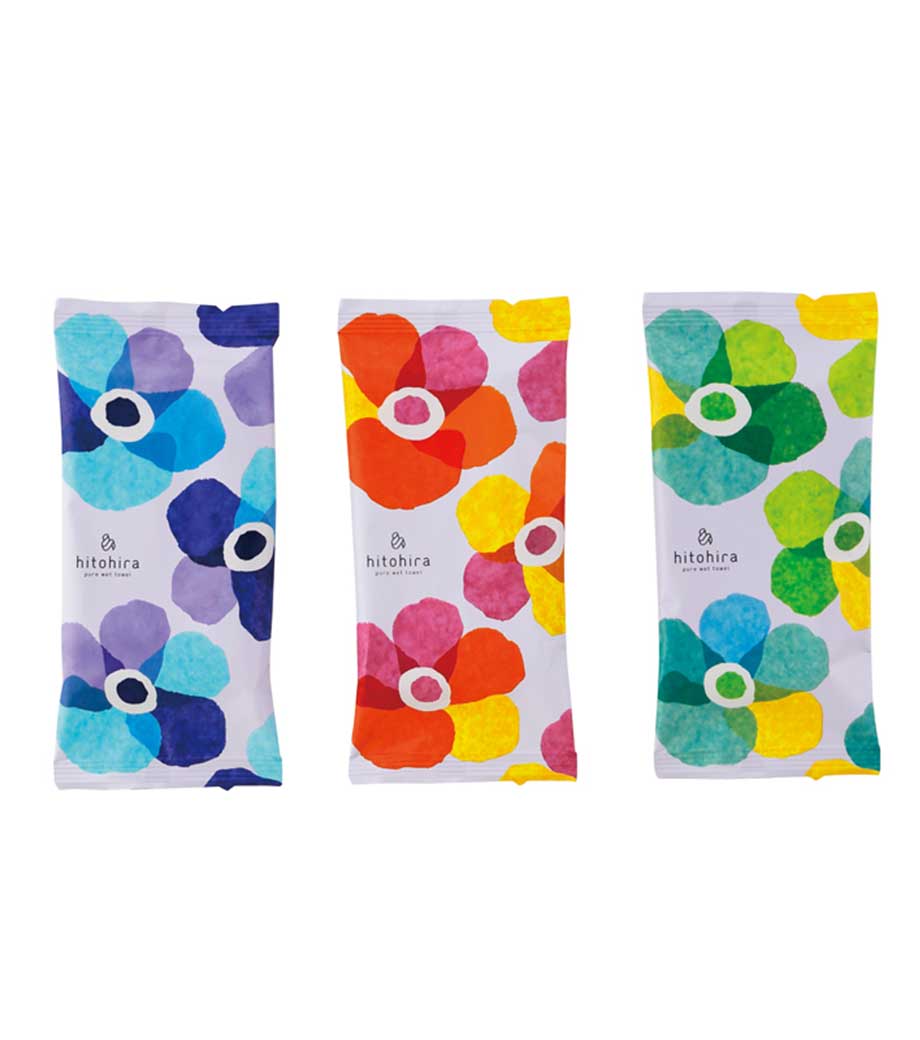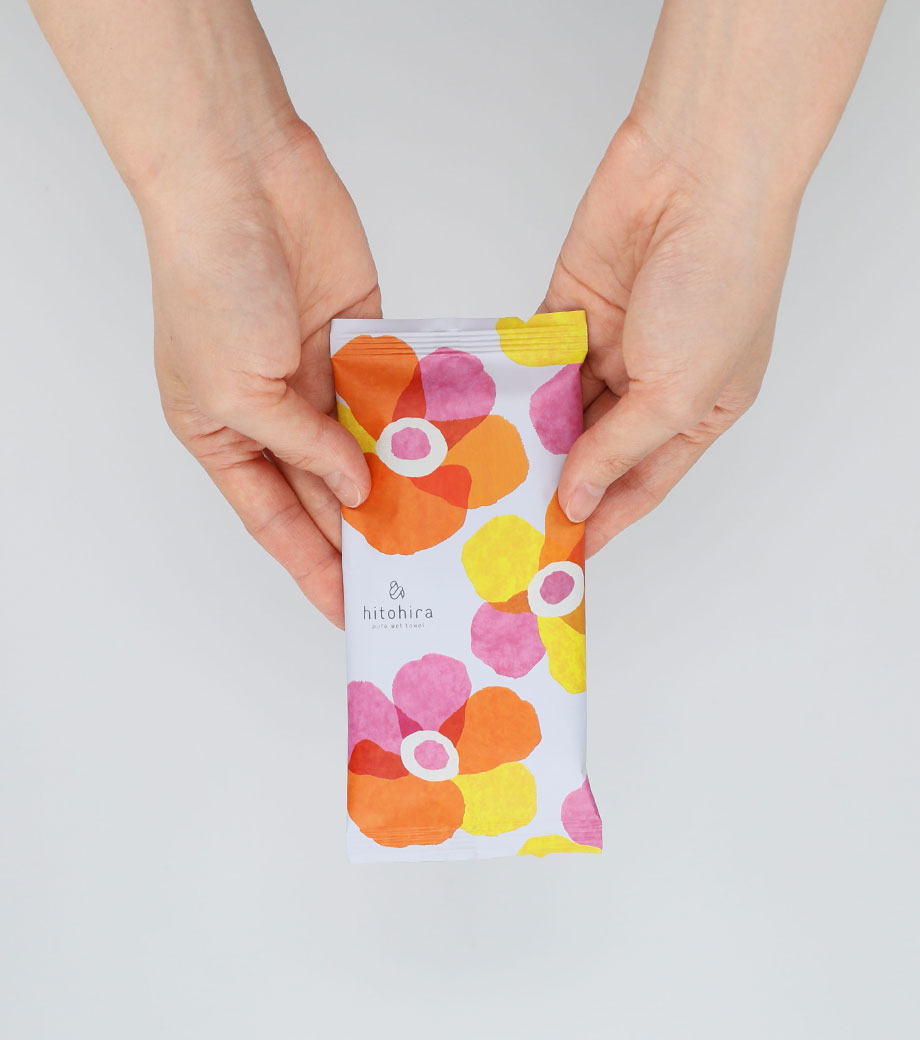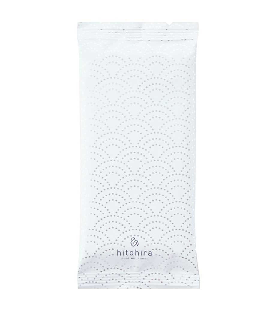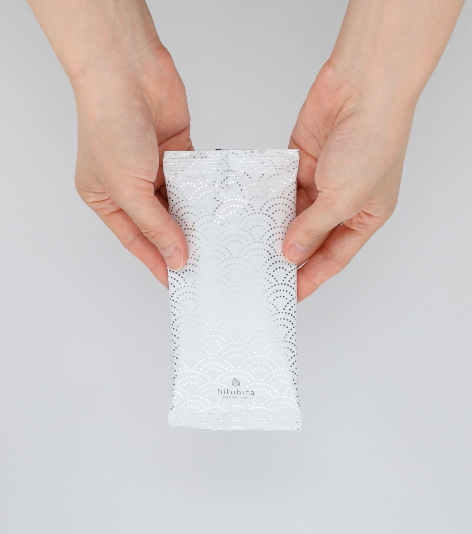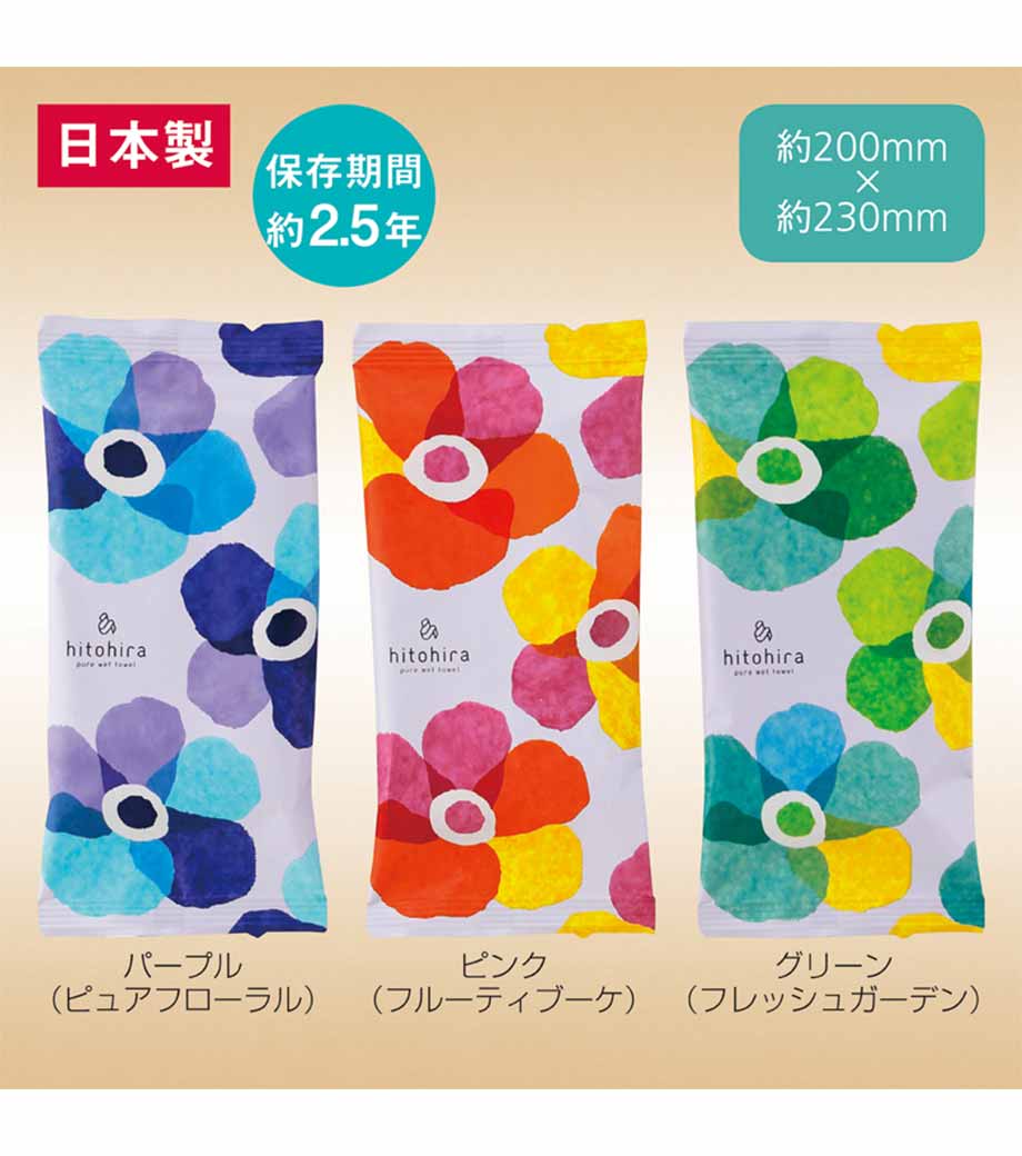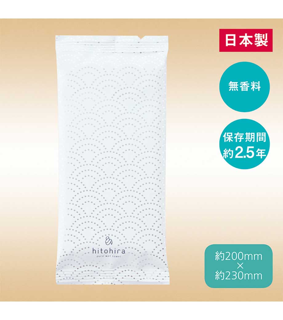 フラップ(開閉部分)に1色でオリジナル印刷可能なウェットティッシュ。袋に耐光性・防湿性の高いアルミ蒸着の3層構造フィルムを採用しており、5年長期保存に対応しています。防災備蓄品としてはもちろん、非常持ち出し袋に1つあると安心のアイテムです。約20×30センチの大判のシートが10枚入り。日本製なのもうれしいポイントです。