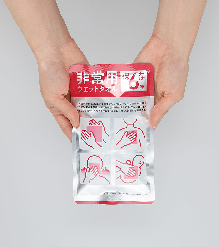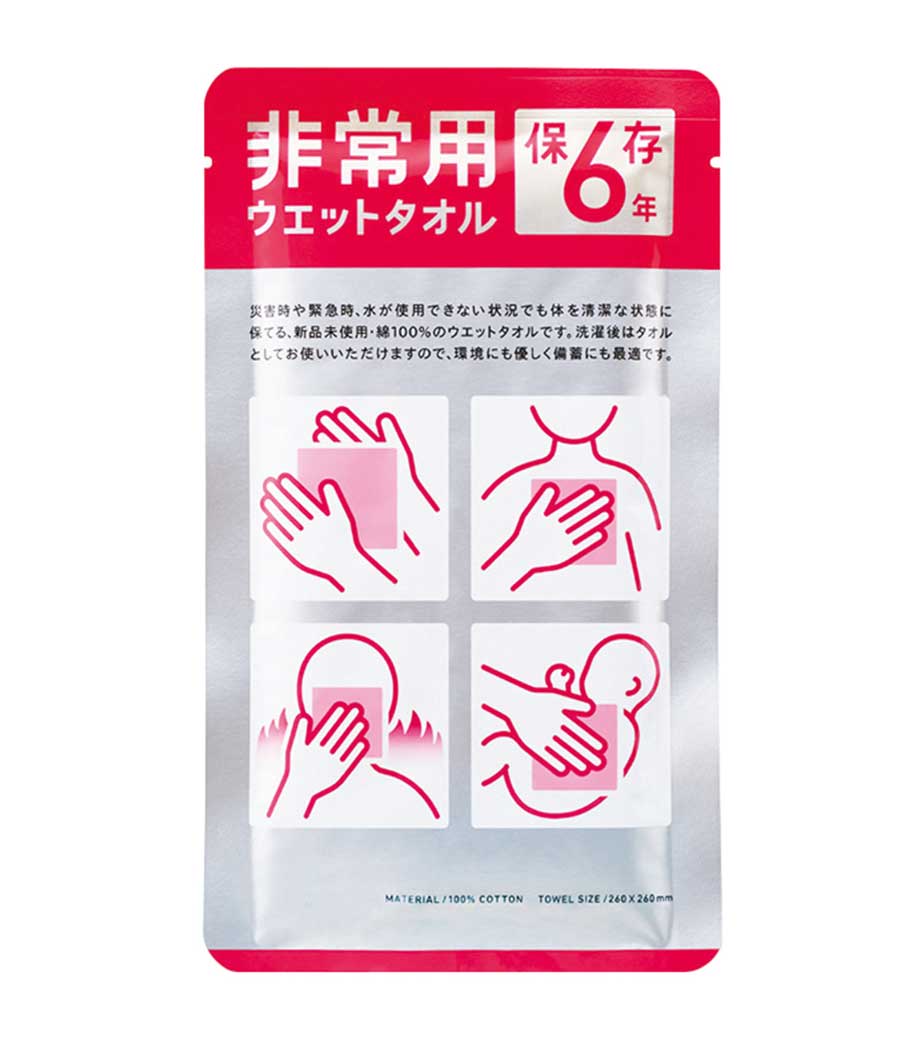 フルカラーデザインのフラップ(開閉部分)をオリジナルで作れるウェットティッシュ。袋に耐光性・防湿性の高いアルミ蒸着の3層構造フィルムを採用しており、5年長期保存に対応しています。約20×30センチの大判のシート10枚入り。防災備蓄品としてはもちろん、非常持ち出し袋に1つあると安心のアイテムです。信頼の日本製なのもポイント。