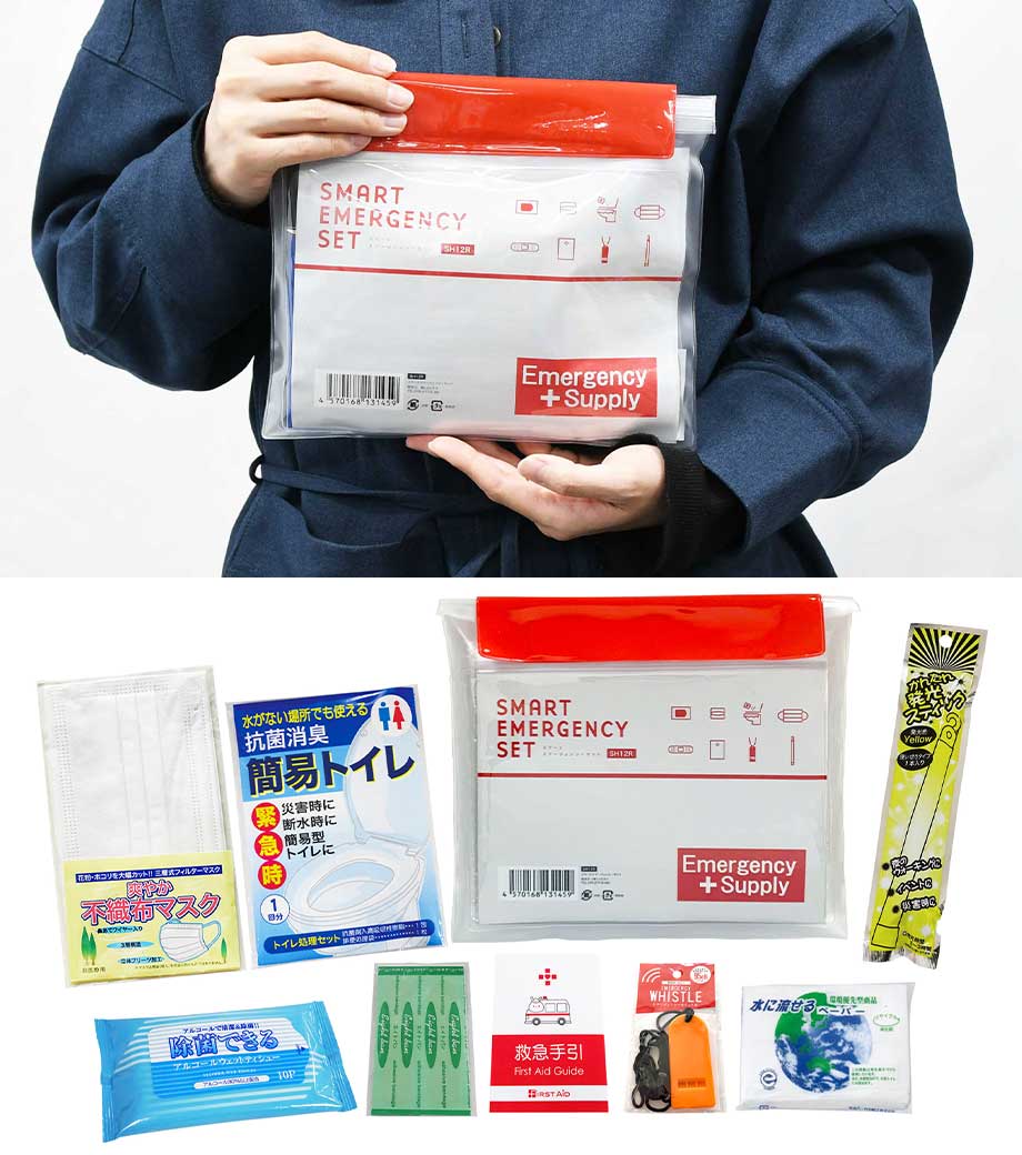 災害時に役立つ防災グッズを1つにまとめました。不織布マスク・ウェットティッシュといった衛生対策用品から、避難時に使える軍手・ホイッスル・ライト、避難所で使えるアルミブランケット・ゴミ袋・圧縮タオルといった最低限揃えたいものが入っています。意外と忘れがちなメモセットがあるのも嬉しいポイントです。