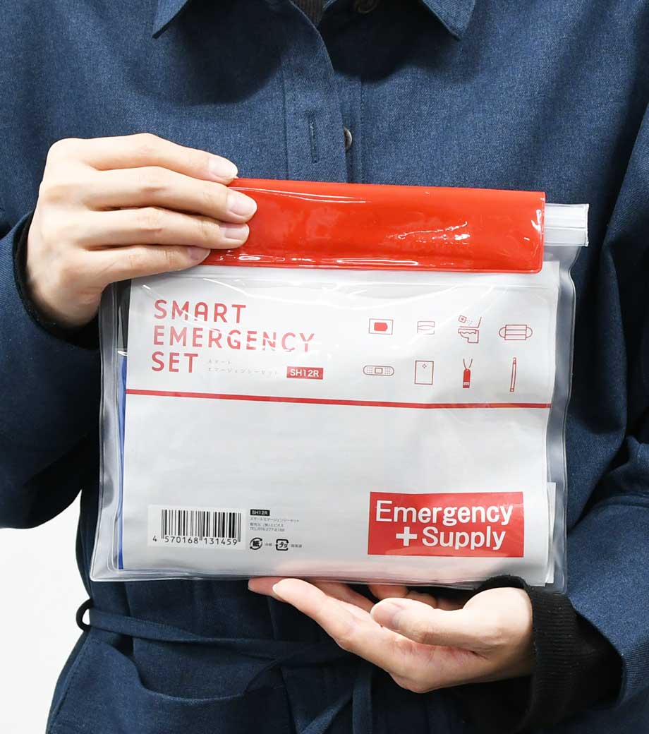 今や必需品となったマスクや水だけで簡単に戻せる圧縮タオル、寒さを凌げるアルミブランケットなどが入っていて緊急時も安心。ポーチの片面が透明なので、パッと見てすぐに中身を取り出せます。企業名などを印刷して、防災イベントのノベルティにおすすめです。