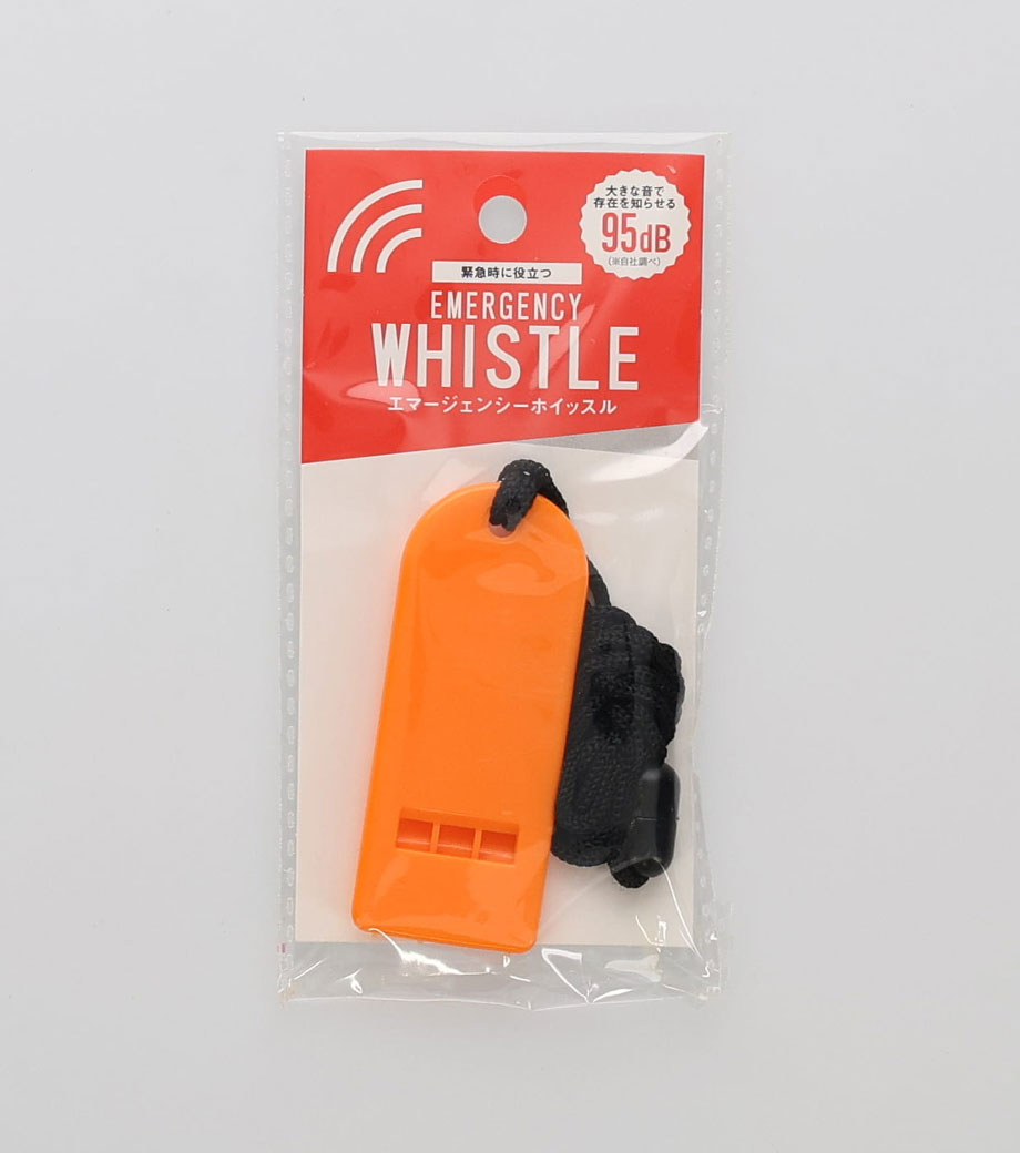 エマージェンシーホイッスルは、人の耳に届きやすい周波数の音が大音量で響くホイッスル。災害・防犯の必需品です。付属のネックストラップは、強い力で引くと外れる安全ストラップを採用。国際的に救難色とされているオレンジ色は視認性・誘目性が抜群です。平たく薄いのでポケットに収納しやすく、紐の長さを調整すればランドセルにも取り付けられます。