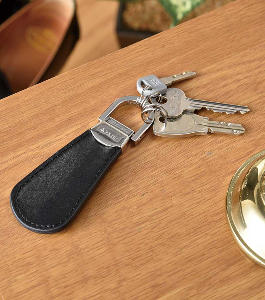 外出先で靴を履く際に便利な、キーホルダータイプの靴べらです。上質な牛革を使用しており、手に取るだけで高級感を感じられる仕上がり。キーホルダーとして使える輪っかが3つ付いているため、複数の鍵や小物をまとめて持ち歩けます。