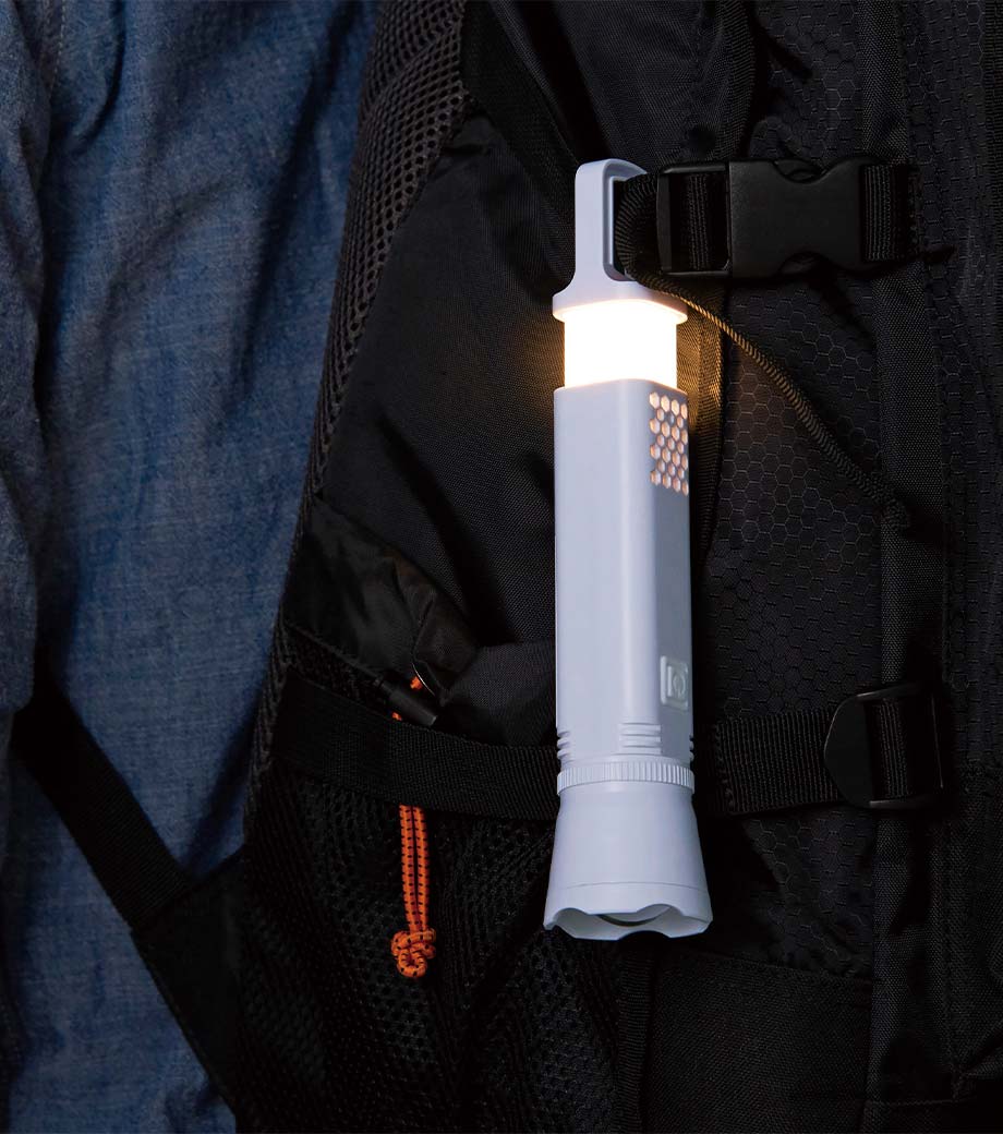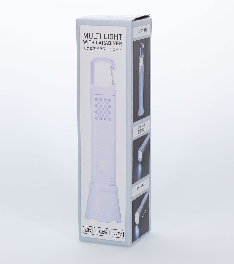ハンディ・吊り下げ・ランタンの3WAYで使える万能ライトです。ヘッド部分を伸縮させればスポットからワイドまで自在にライトの切替が可能。カラビナを引っ張るとランタンとして使用できます。操作はスイッチを押すと<強→弱→点滅→ランタン→消灯>と簡単。カラビナ付きで鞄やリュックに付けられ、軽量でスリムだから持ち運びやすい。