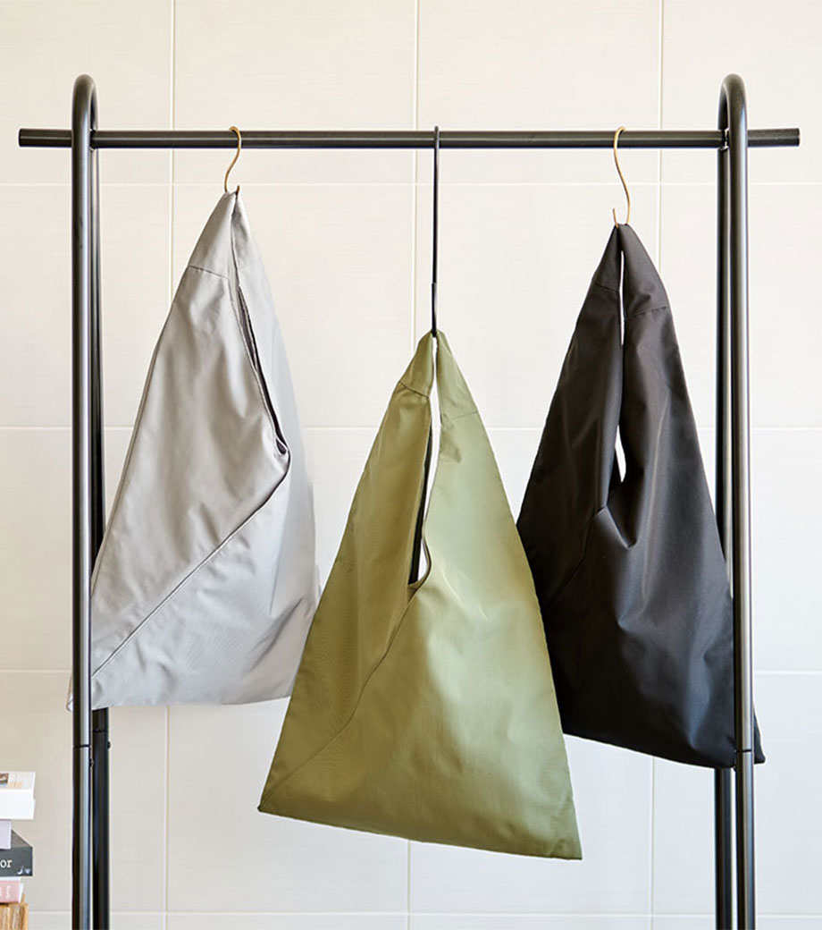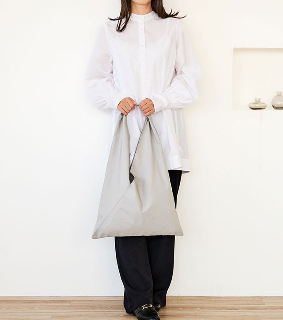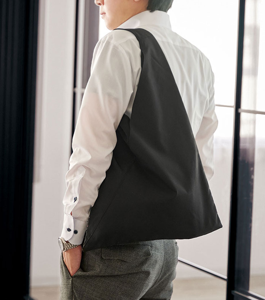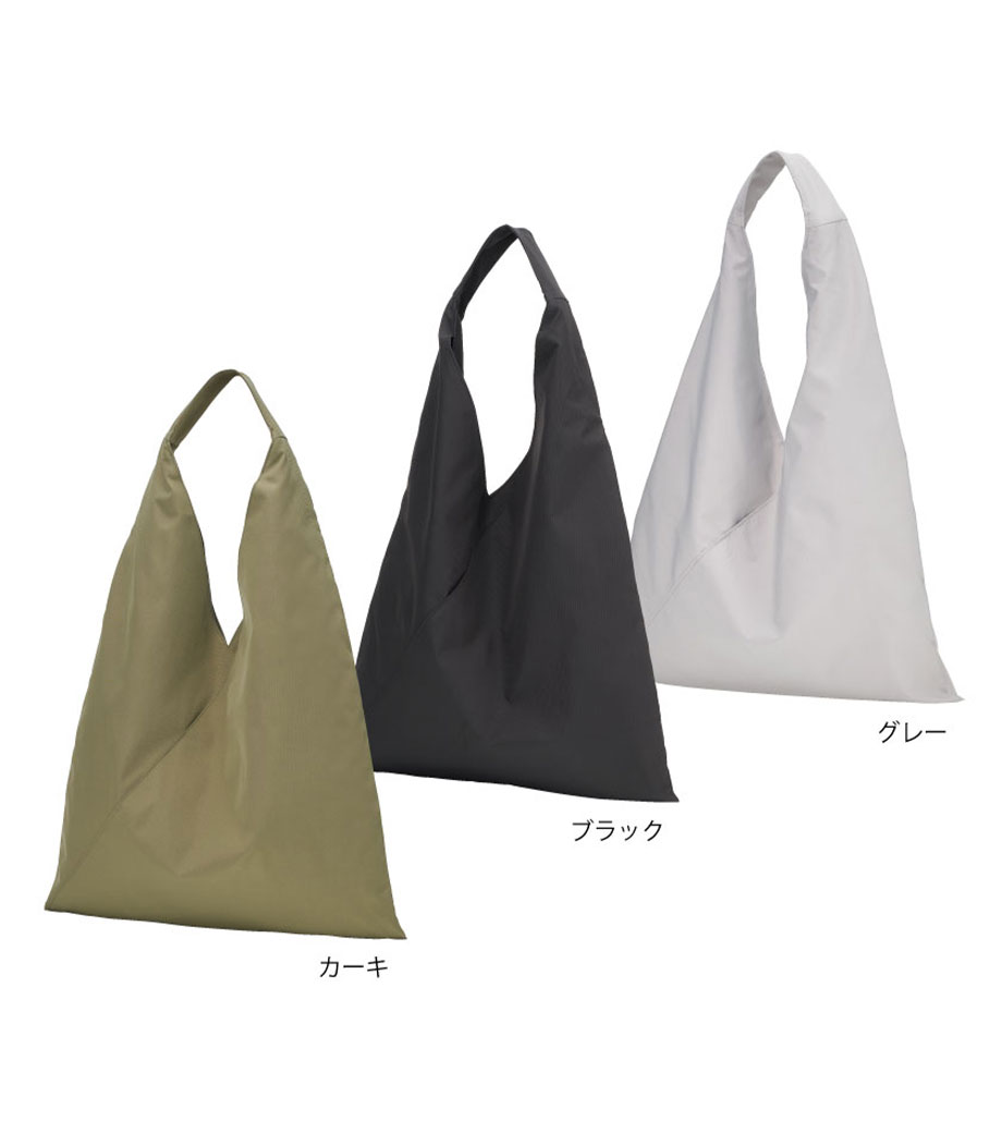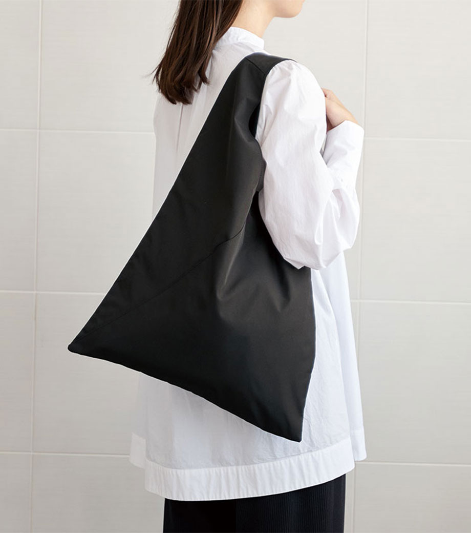 三角のフォルムがユニークなフラットトートバッグです。前面には小物を収納できるポケット付き。スマホや鍵などの出し入れもスムーズです。内側には仕切りもあります。長めのハンドルで肩掛けOK!通勤・通学はもちろん、休日のお出かけにも活躍してくれます。耐荷重は約10㎏もあるので、お買い得の重いお米やペットボトルを買ったときでも安心ですよ。
